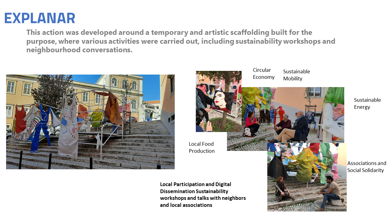 The activities were developed targeting the local community, with the aim of creating a space for experimentation and information on various topics related to sustainability. Workshops were created for experimentation and information on urban gardens, reduction of energy consumption, reuse of textiles through patchwork techniques. A set of neighbourhood talks involving several stakeholders with activities relevant to the theme of sustainability were also held in the physical space of the artistic esplanade. They shared with us innovative ideas on sustainable mobility, on the circularity of textiles and building materials, on social action and inclusiveness and on urban agriculture and new technologies. The conversations with neighbours were very enriching and allowed us to get to know new and old residents of the neighbourhood.
