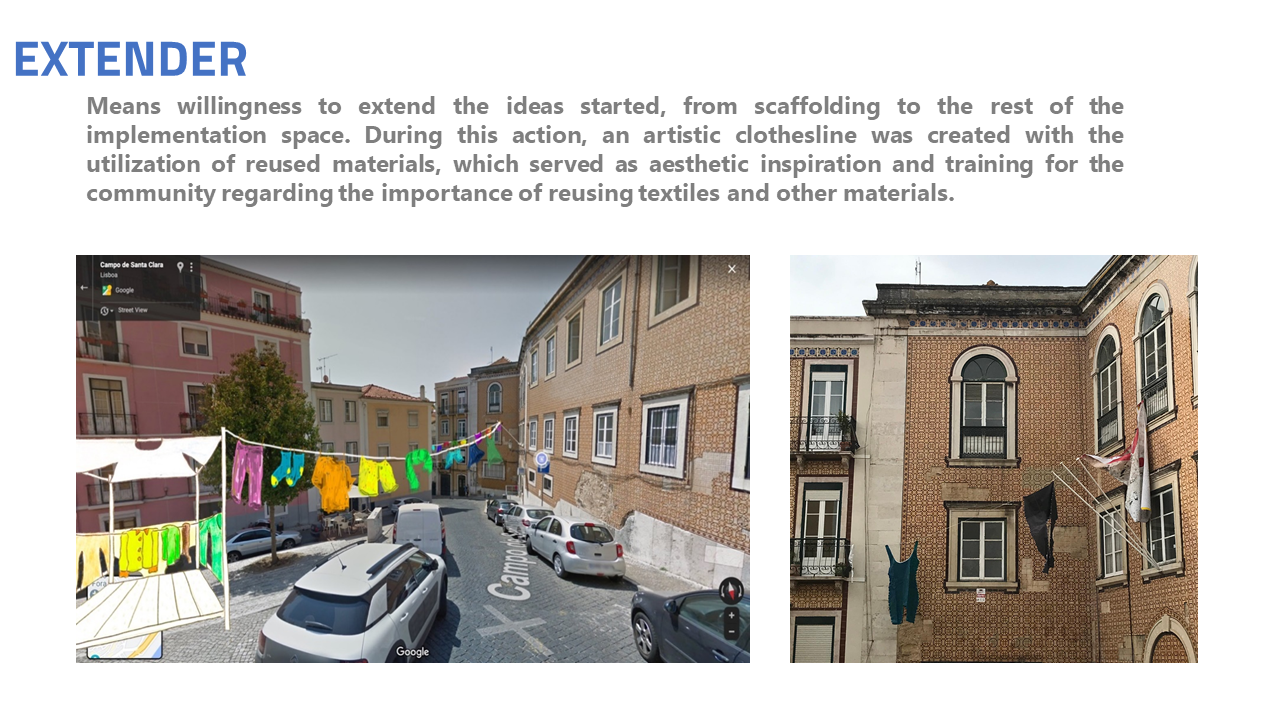 The second action, Extender (fig. 3), means willingness to extend the ideas started, from scaffolding to the rest of the implementation space. During this action, an artistic clothesline was created with the utilization of reused materials, which served as aesthetic inspiration and training for the community regarding the importance of reusing textiles and other materials.