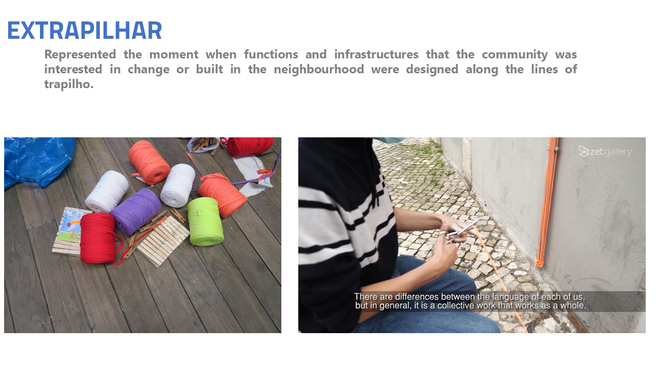 The third action Extrapilhar (fig.4), represented the moment when functions and infrastructures that the community was interested in change or built in the neighbourhood were designed along the lines of tshirtyarn.