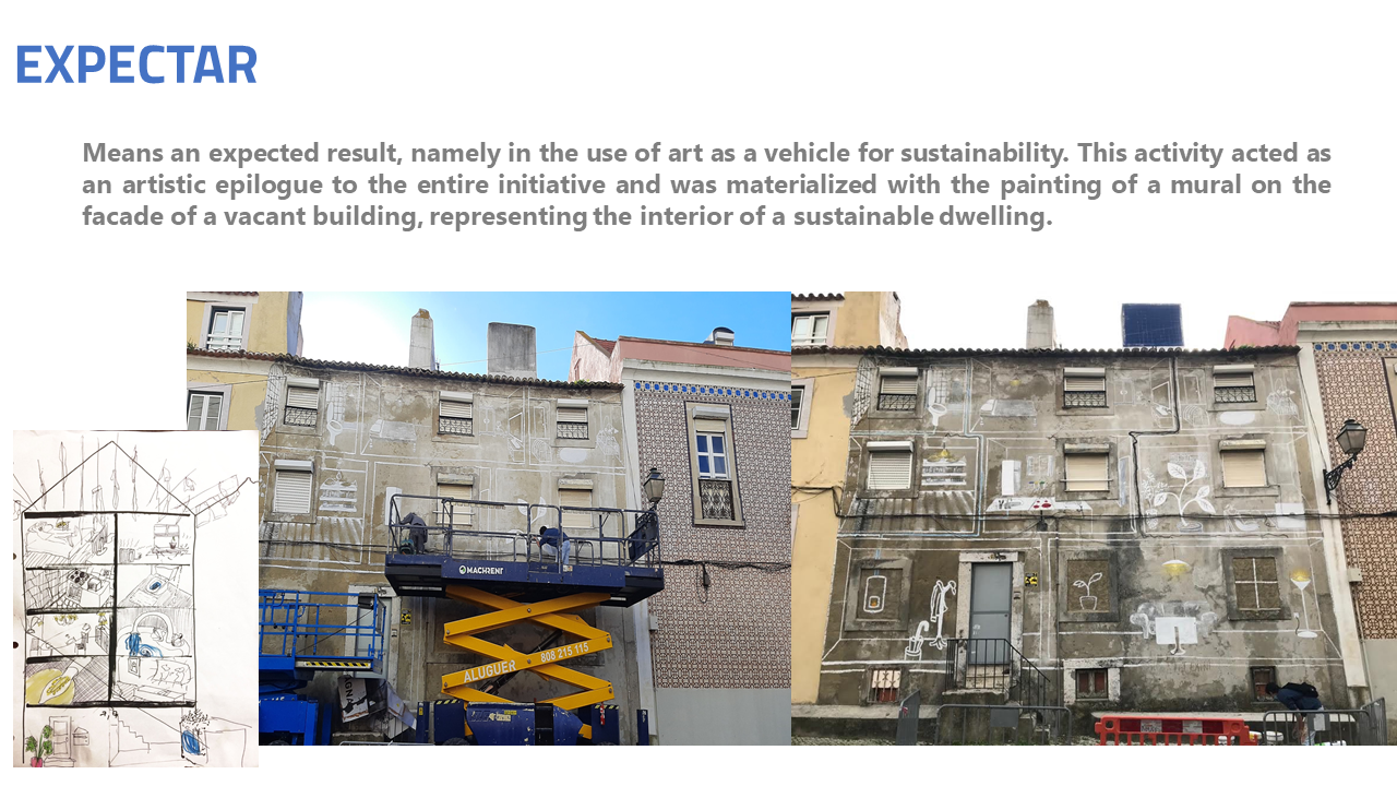 The last action Expectar (fig. 5), means an expected result, namely in the use of art as a vehicle for sustainability. This activity acted as an artistic epilogue to the entire initiative and was materialized with the painting of a mural on the facade of a vacant building, representing the interior of a sustainable dwelling.