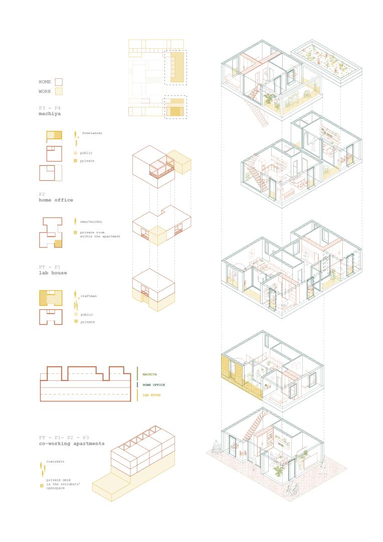 In a scenario based on economic circularity and production, in the area of the former slaughterhouse in Milan, the theme that emerges at first is the one of work and its relationship with the residence. A dualism that is embodied in four types of housing within the same residential complex, thus able to offer a complete and diversified offer to the public.