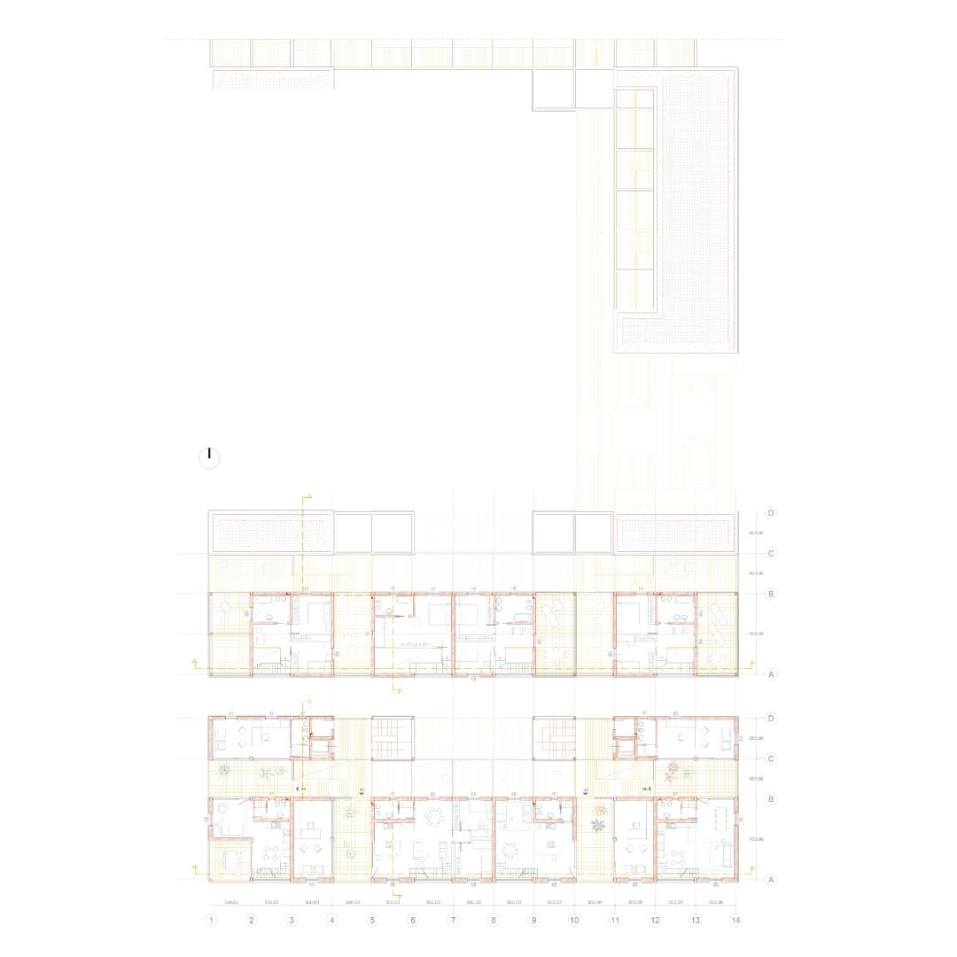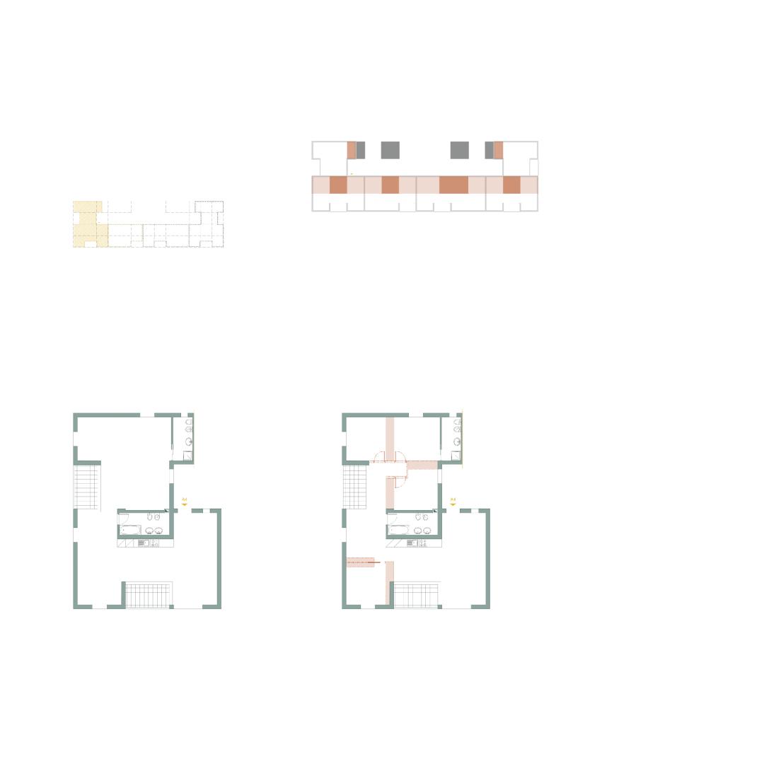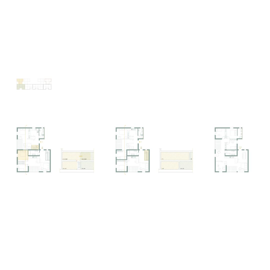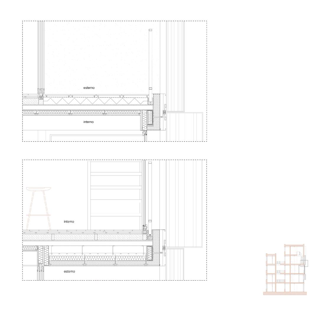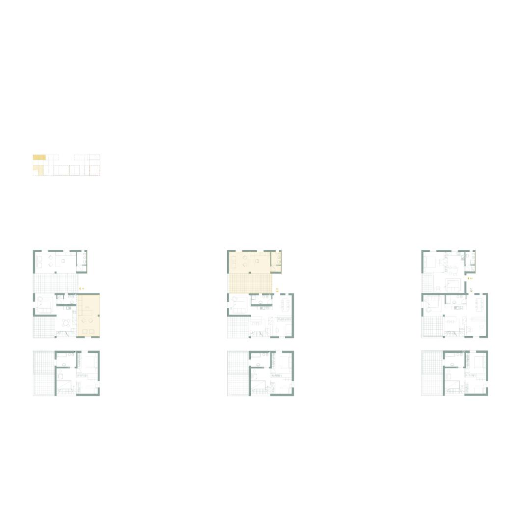 The modularity with which the building was conceived made it possible to obtain a certain flexibility as regards the different housing units: it is possible to sell / acquire a module from the adjacent apartments as well as to make the two levels of the laboratory house independent, thus modifying the apartment until reaching a final configuration that we believe to be that of the home-office. In addition to this type of flexibility "over time", a type of flexibility "at time 0" has been studied since the only fixed parts inside the apartments are the service-kitchen blocks while the rest of the space is articulated through wall systems/wardrobes and mobile divisions.