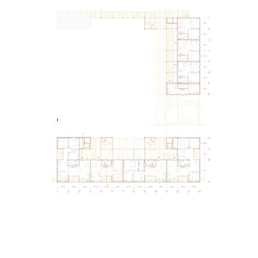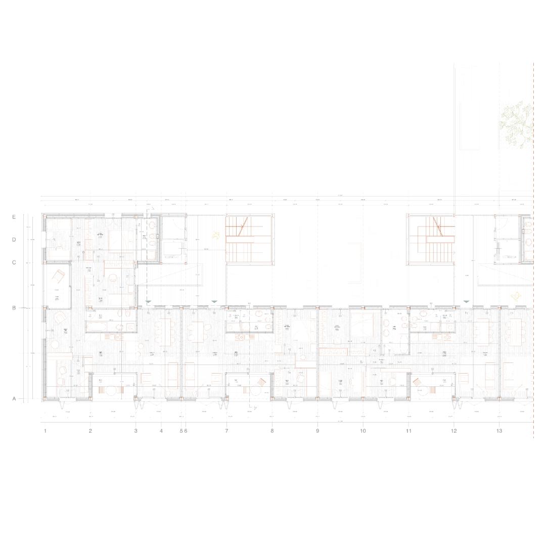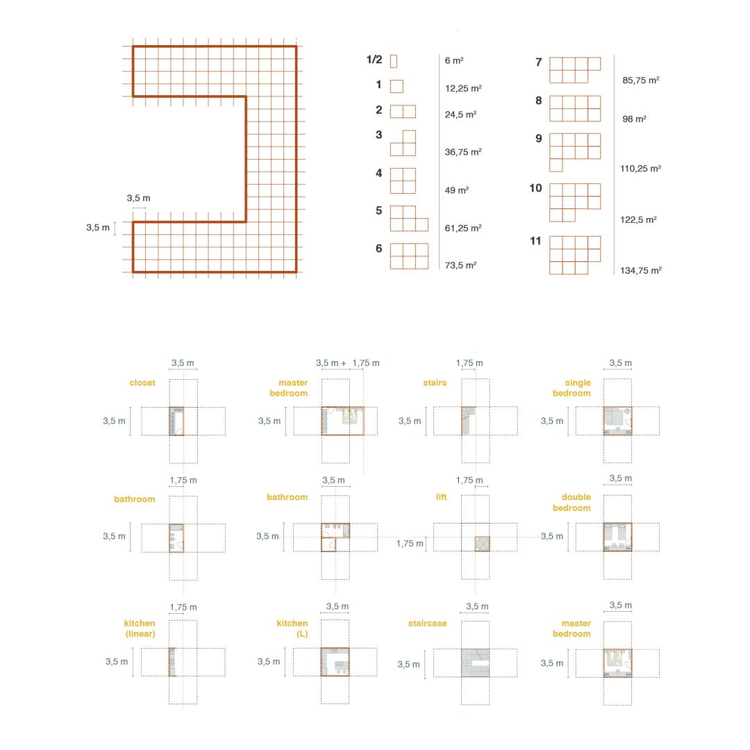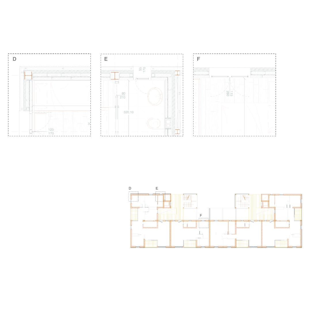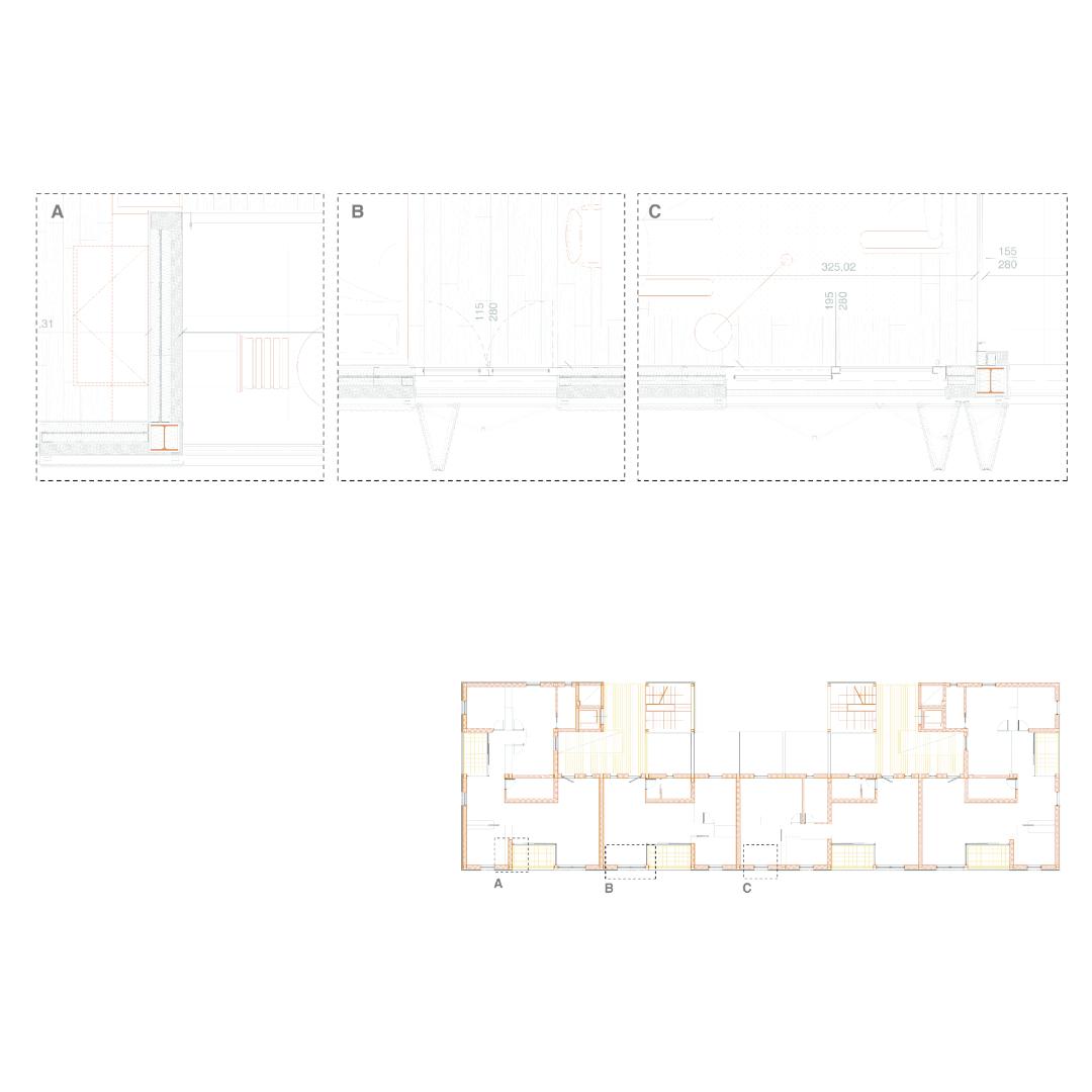 The modularity with which the building was conceived made it possible to obtain a certain flexibility as regards the different housing units: it is possible to sell / acquire a module from the adjacent apartments as well as to make the two levels of the laboratory house independent, thus modifying the apartment until reaching a final configuration that we believe to be that of the home-office. In addition to this type of flexibility "over time", a type of flexibility "at time 0" has been studied since the only fixed parts inside the apartments are the service-kitchen blocks while the rest of the space is articulated through wall systems/wardrobes and mobile divisions.