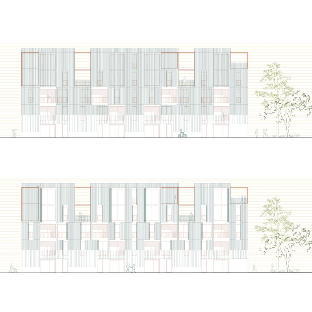 The building was designed considering high-quality spatial characteristics: each apartment has an external space of relevance as well as the common courtyard within the complex. Furthermore, the greenhouse that completes the residential complex was designed as a space dedicated to residents with the aim of offering a common experience of cultivation and maintenance of the green, increasing the opportunities for workers to carry out a common project and to take part to the production and consumption cycle of the system in which the building stands. The use of the square module has given rise to a modular building also in elevation; to the south elevation it has been treated with a thin micro-perforated aluminum sheet coating capable of creating different effects with what is behind it: a window, a loggia or a terrace. Furthermore, in correspondence with the basement, this cladding changes pace, generating an aesthetic effect that allows you to identify the most public part of the building, where the craft shops are.