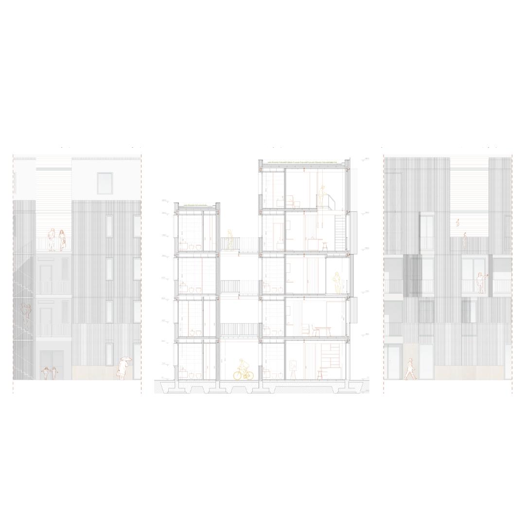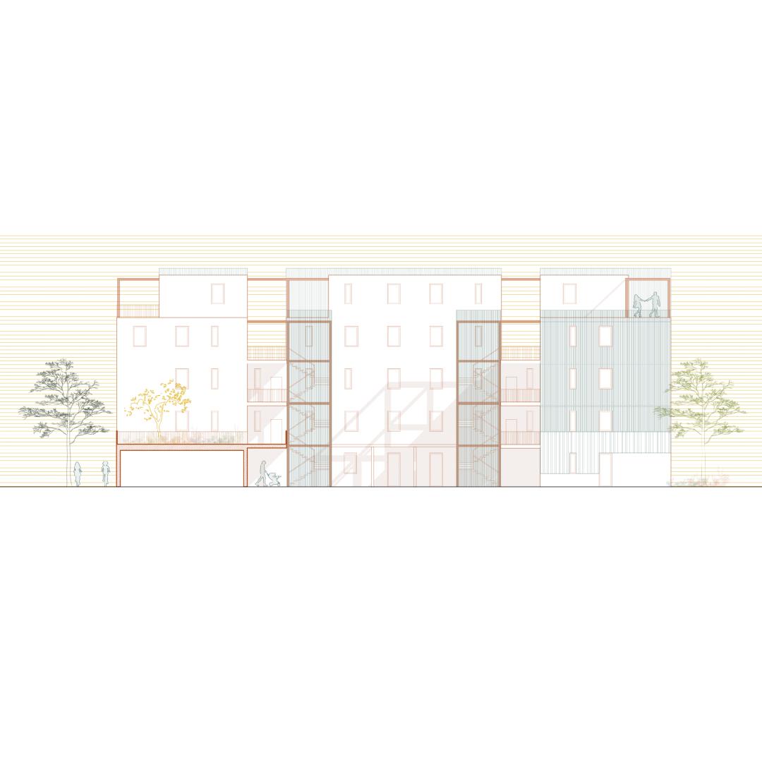 The building has a C-shape and hides a courtyard inside: the two horizontal bodies follow a common strategy and are entirely dedicated to the apartments, while the vertical connecting body has a public co-working space on the ground floor and on the first floor from which you access an outdoor terrace facing both inwards and towards the street and apartments on the next two levels.