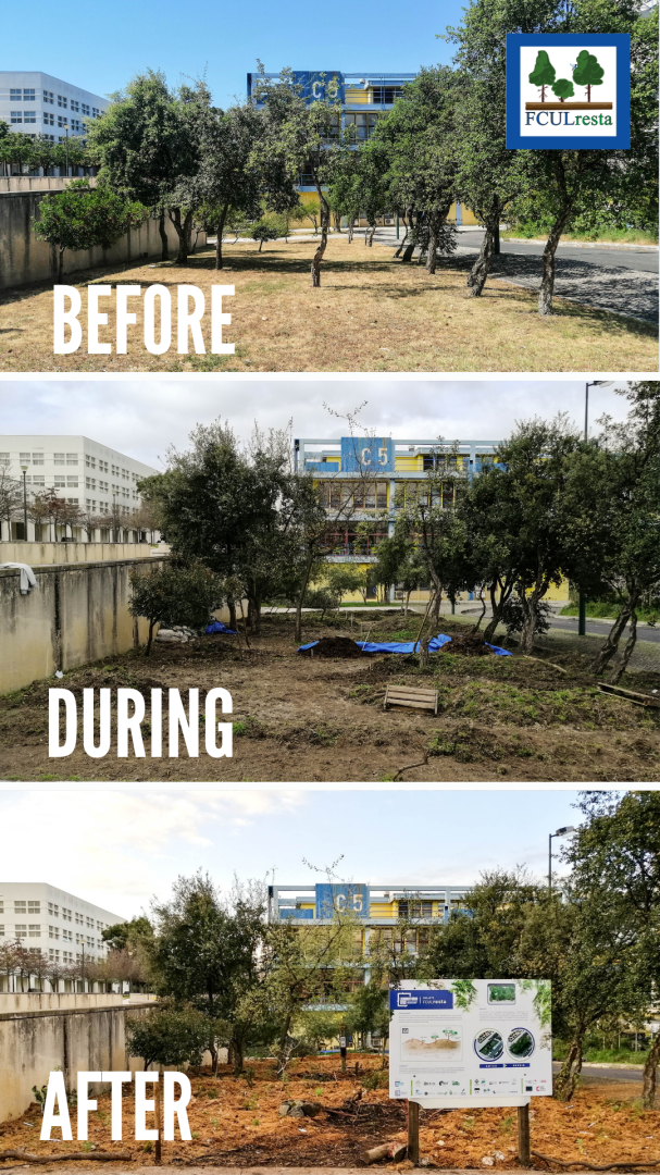 FCULresta is a tiny, dense, biodiverse and multifunctional forest created and nurtured in an urban context. It aims to become a hands-on reference on a transdisciplinary approach, with a profound mobilization of society towards climate action, enhancement of urban biodiversity and other Sustainable Development Goals of the Faculty of Sciences of the University of Lisbon (Ciências ULisboa) and its city as the Green Capital of Europe 2020. It will also act as a case study to evaluate the potential of the Miyawaki Method on climate action in the Mediterranean and other ecosystem services in the urban context, through different research questions that aim to look at the project as a whole.