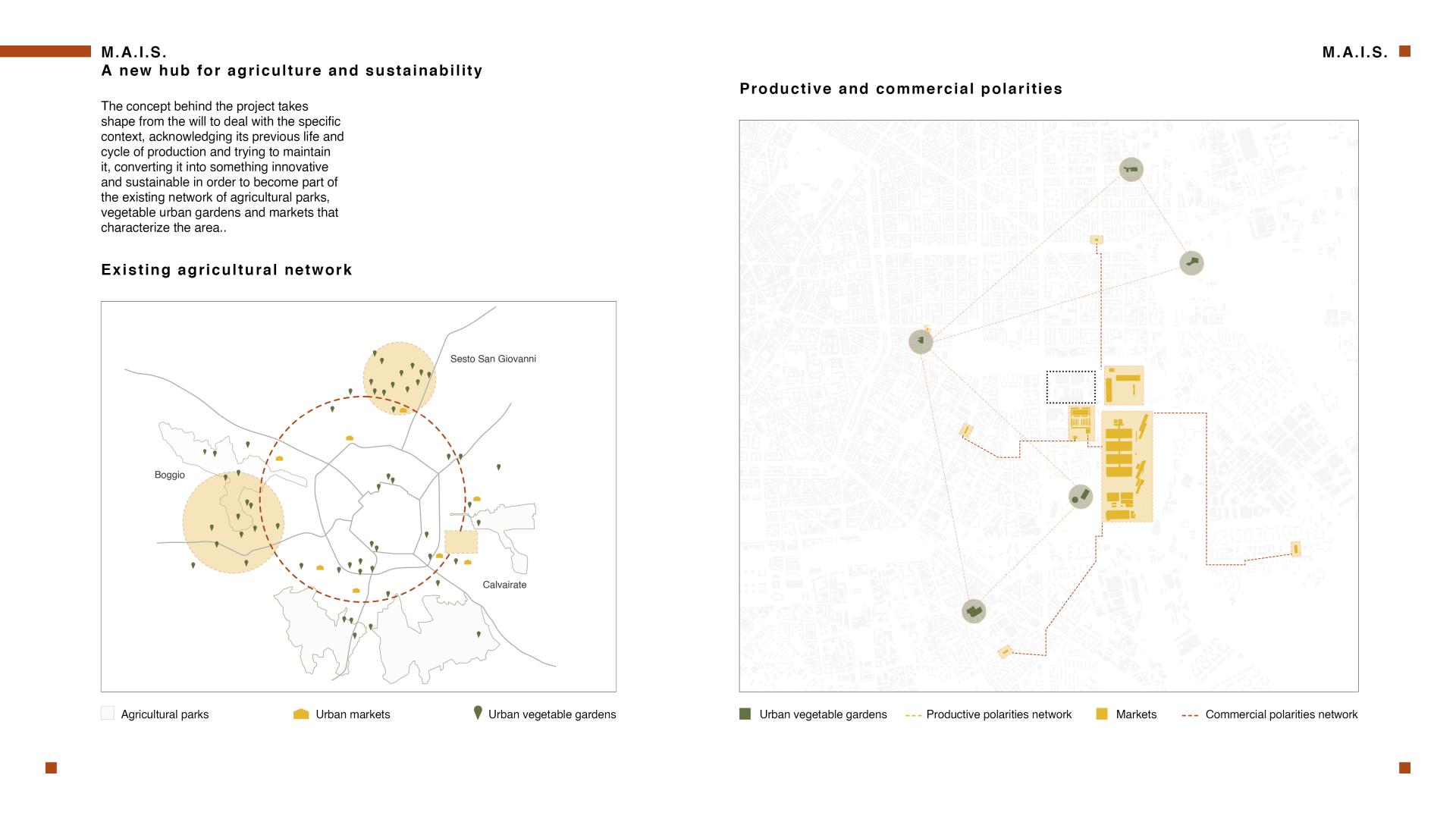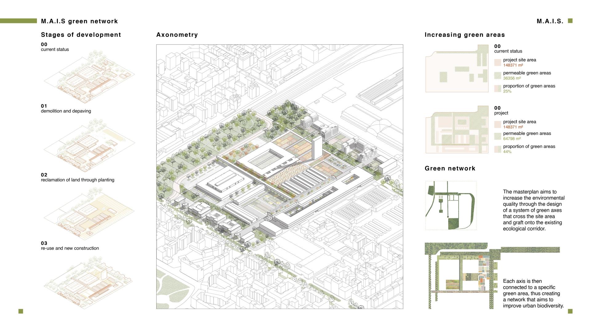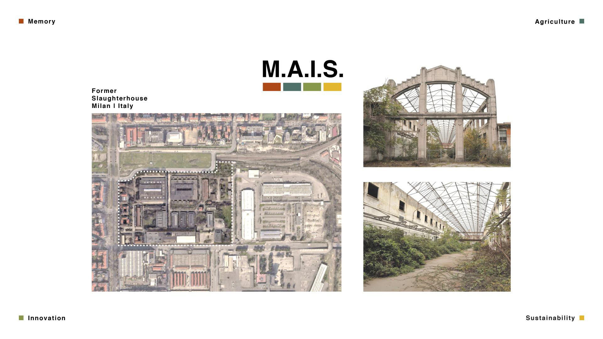 M.A.I.S. is an urban regeneration of the ex-slaughterhouse area in Milan. The acronym stands for Memory.Agriculture.Innovation.Sustainability, the principles on which we built the concept of the entire masterplan. The project is thought to be developed through different progressive steps, starting from today’s situation of abandonment and intense cementification and evolving towards a greener and healthier place rich in biodiversity and activities capable to include people with different needs.