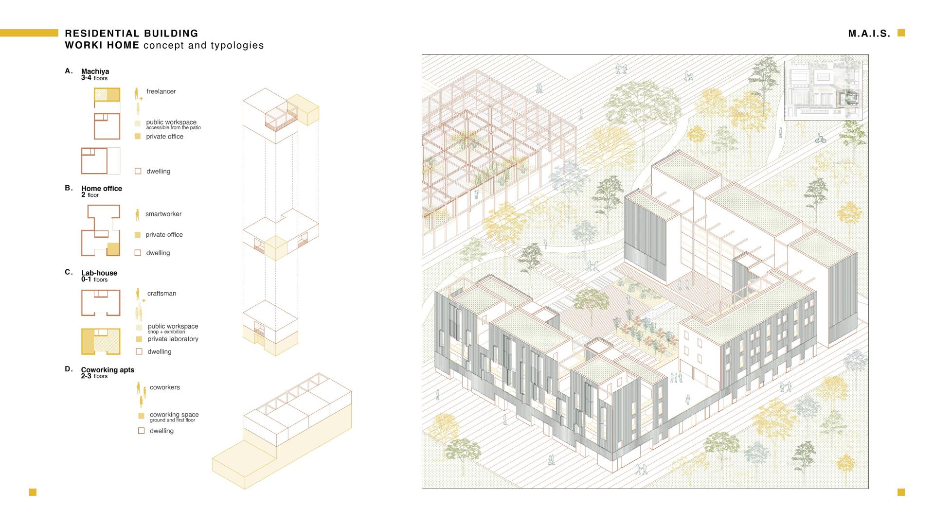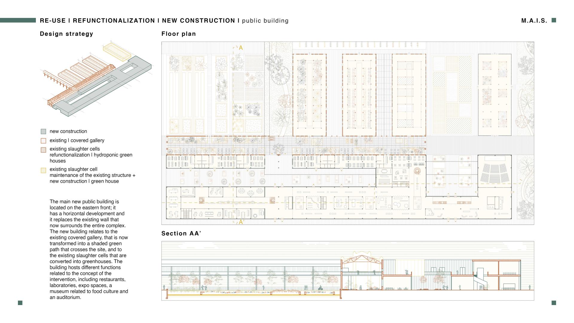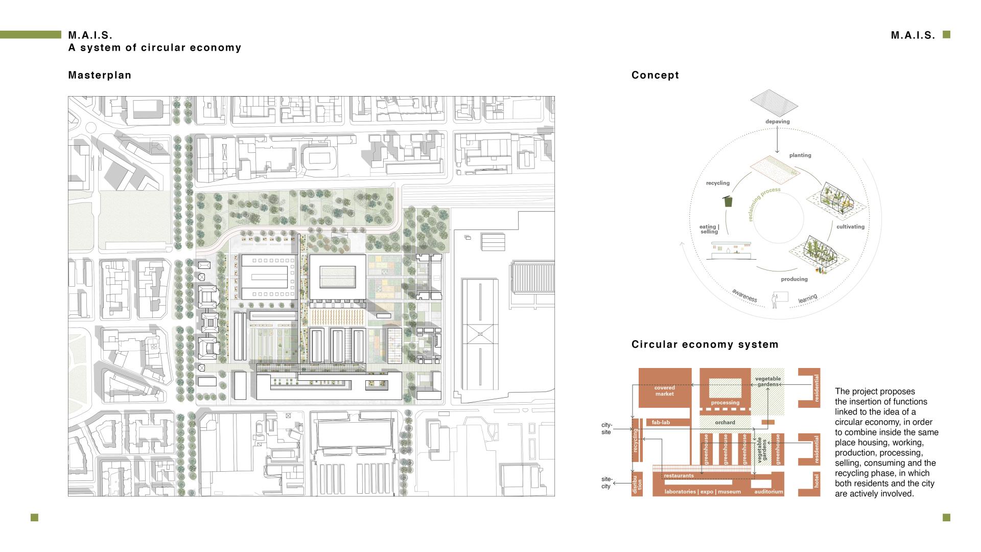 The concept around which every piece of the masterplan revolves is contained in the name of the project and it consists in the union of memory, agriculture, innovation and sustainability. Memory represents our way of dealing with the context in which we worked, acknowledging its previous life and cycle of production and trying to maintain it, converting it into something innovative and sustainable for a vivid city like Milan. The ex-slaughterhouse becomes in this way a place where producing, processing, selling, living, working and recycling are the steps of a new working chain based on agriculture. Agriculture because, as we realized how close we were to the south agricultural park of Milan, we immediately thought it would be interesting to get more involved and physically (through cycling ways) and conceptually connected to it. We also believe that nature, conceived as something in which and with which people could work and live in a constant exchange, could be the key for getting the citizens to be more involved with the place where they live, helping the rise of inclusive practices. Innovation because we believe that this area should become a landmark in the city, a place where new ways of living, working and studying take place and blend among each other: a system of circular economy that includes housing, working, producing, selling, consuming and recycling. Sustainability because the whole project starts from the idea of turning the area into something more attentive to the impacts of human practices, re-introducing nature, trying to keep the most of the existing buildings we could and renovating them instead of tearing them apart, re-using the soil of the excavations throughout the site and always choosing the greener solution over the others, after a precise Life Cycle Assessment confrontation.