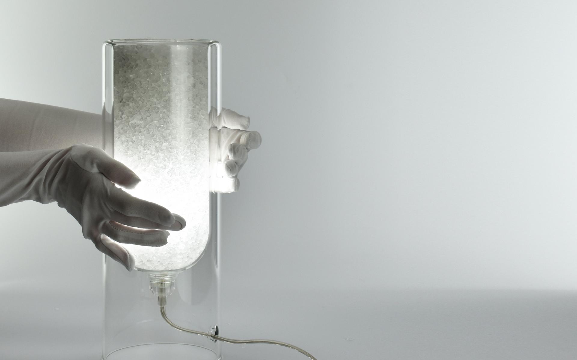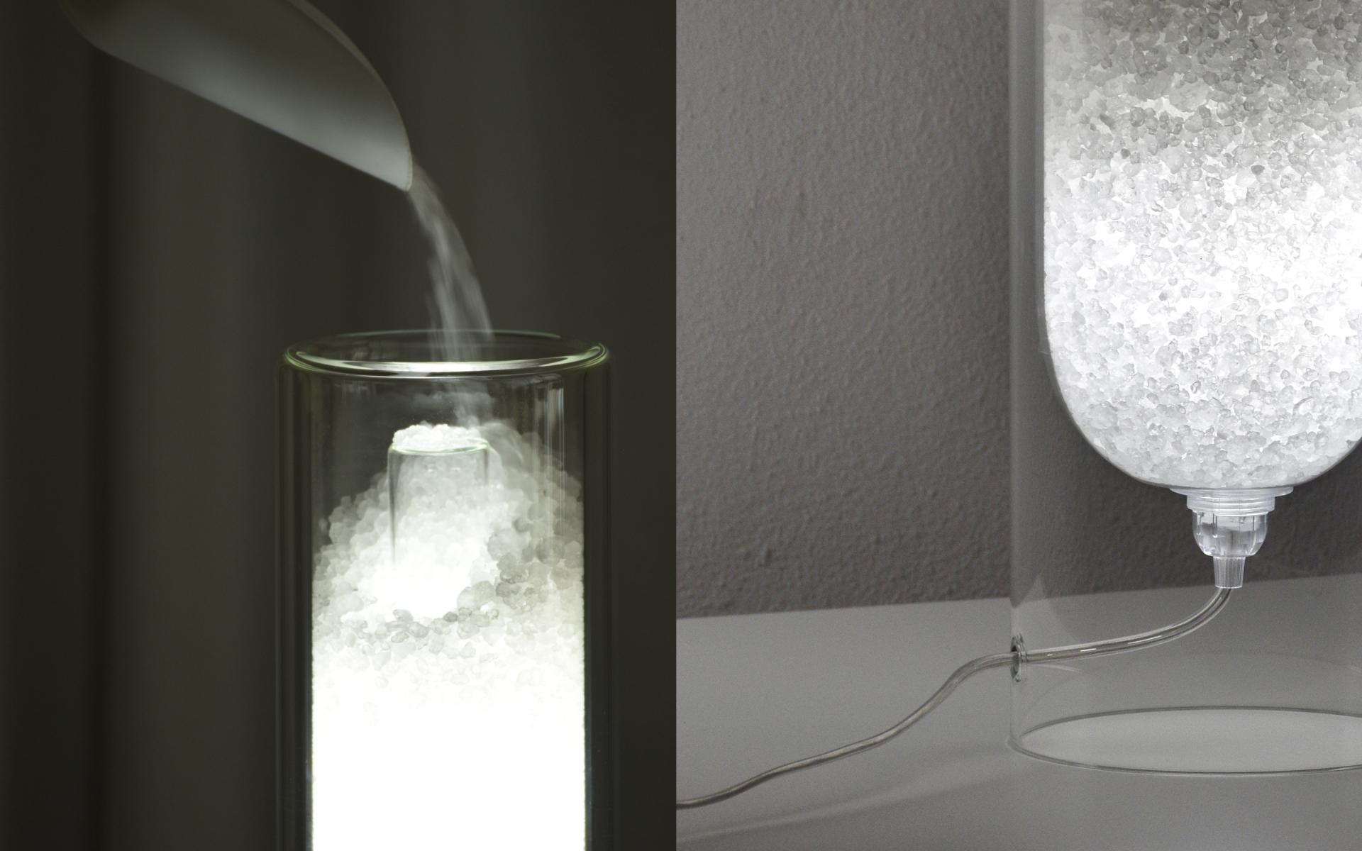 The final result includes a double-walled glass lamp - for the conservation of the heat emitted by the high-efficiency bulb -, a second internal glass body, which protects the bulb from any moisture collected by the salt and absorbed by a second material, internal, always of natural origin. Furthermore, one of the main characteristics of a sustainable object was thought of durability.