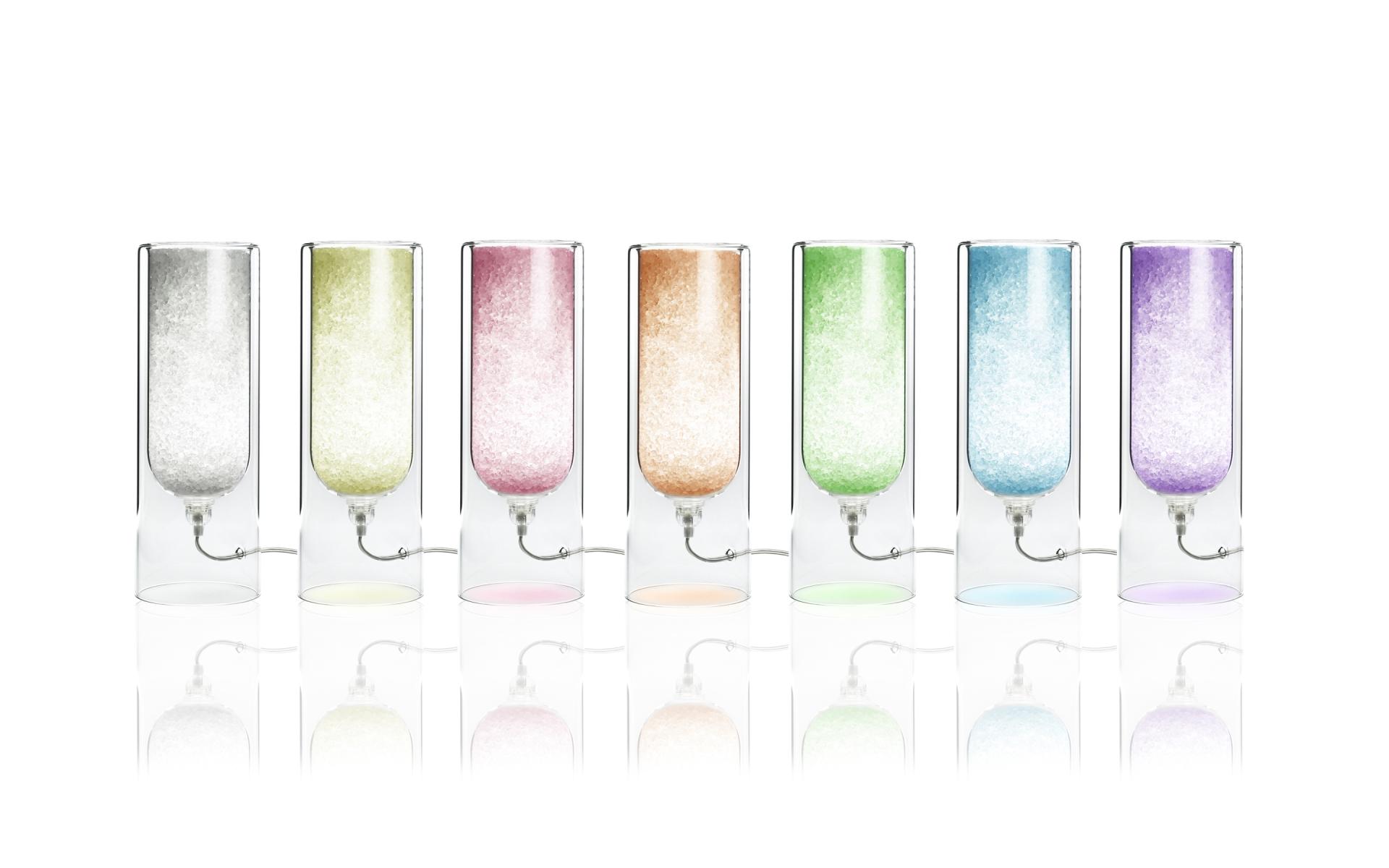 The rock salt crystals, available in eight colors, are housed inside a double-walled glass body, are rechargeable and the energy-efficient internal bulb (2 or 4W LED A ++) is protected by a second glass body, which guarantees its maximum duration over time.