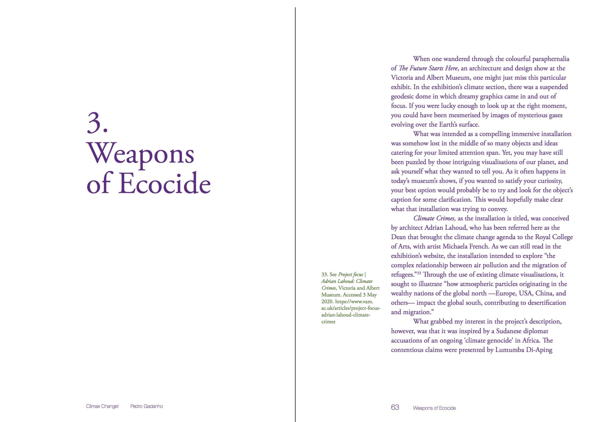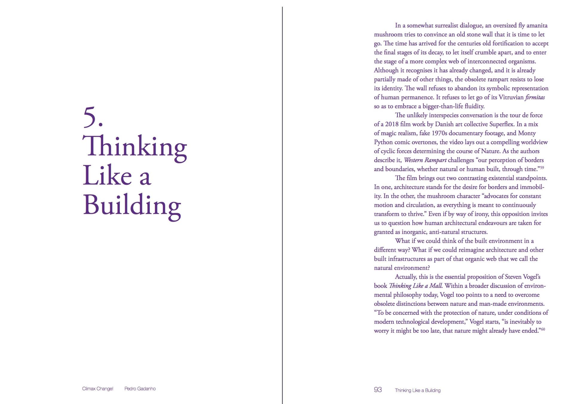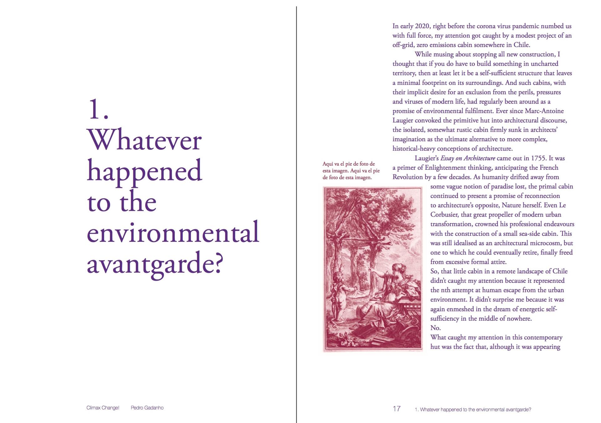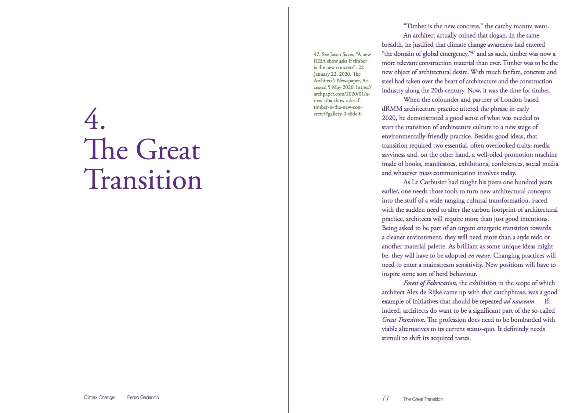Climax Change! calls for a radical change in the overall aesthetics of architecture, advocating that, as much as in early Modernism - and through projects such as the Bauhaus - architects today need again fundamental aesthetic motives so as to change the nature, chosen materials and language of the projects with which they may respond to the ongoing ecological emergency. The climax change that the book advocates for is precisely that of an aesthetic turn, through which environmental concerns become central to architectural thinking and practice.