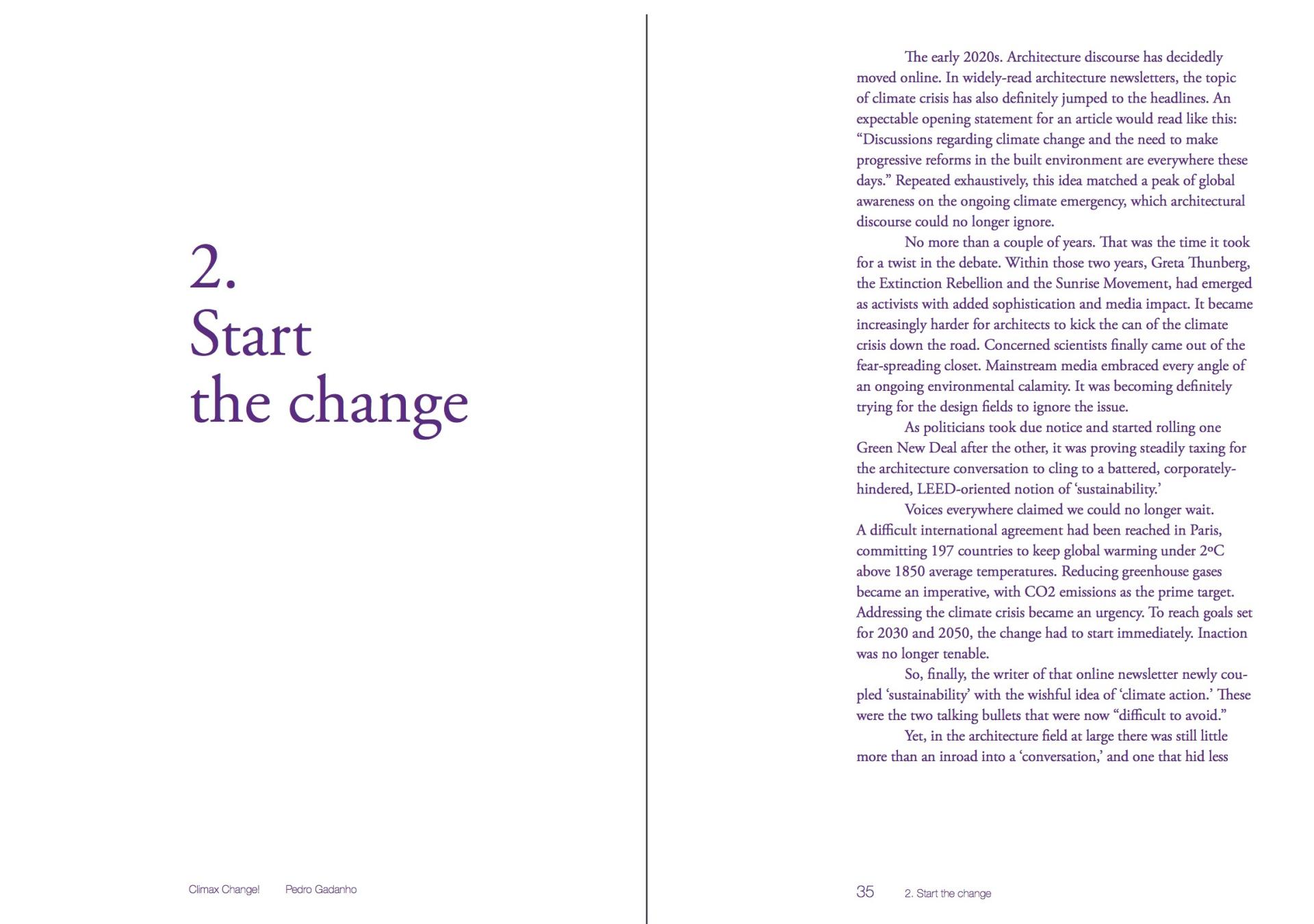 The Climax Change! book represents the much-needed overview of how climate change and the current environmental emergency will affect the practice of architecture, both in terms of direct impacts on its design philosophy and of the opportunities to innovate and radically transform the course of the discipline's aesthetic, ethical and professional drives as they stand today.