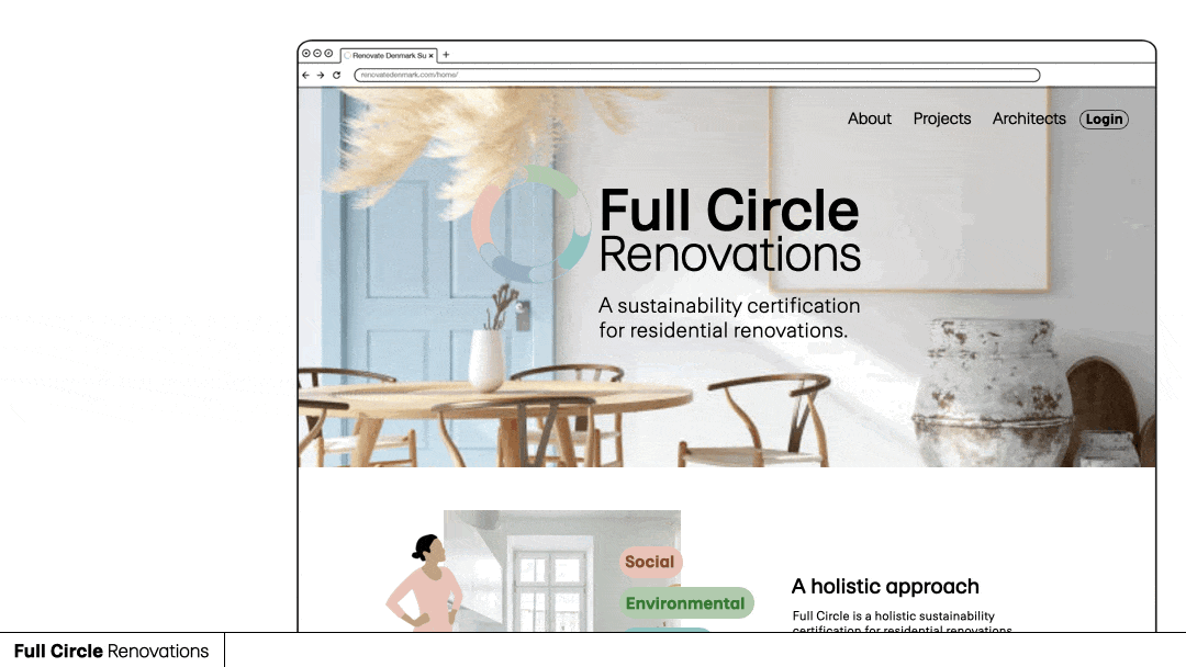 Denmark’s private residential renovation industry needs an overhaul. Studies of the renovated Danish building stock reveal that 60-80% of renovations use incorrect methods and materials1, causing billions of kroner in repairs costs for both owners and the state2. Currently, only 15% of Danish homeowners consult architects and specialists such as energy consultants when doing maintenance or renovations on their home3 - but could architects be the answer to increasing renovation quality and sustainability? Inspired by the European Commission’s Renovation Wave for Europe and New European Bauhaus initiative, Full Circle Renovation will provide a holistic sustainability certification and communication platform to assist architects, homeowners and contractors in making sustainable renovations.