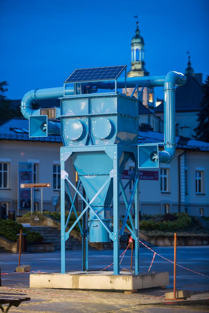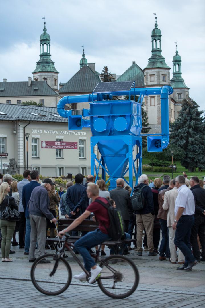 At the same time the sculpture promotes knowledge about the history of the city and the region. The presence of this hybrid of art and industry in Kielce alluded to their historical affiliation to the Old Polish and then the Central Industrial District, which is the oldest mining and metallurgical district in Poland (the first flint mines were established there in the Paleolithic period).Today limestones, sandstones and quartzites are mined here. The processing of these materials is associated with the use of specific devices for segregating rock material and dust removal devices for the halls in which the raw material is processed. "Dust Eater" became a kind of hybrid of this historical and industrial theme and the present day of Kielce. The air-purifying machine sculpture refers to the historical conditions of the city and the region, promotes values related to ecology and shapes the attitude of understanding and respect for the place of residence, specifically in young viewers.