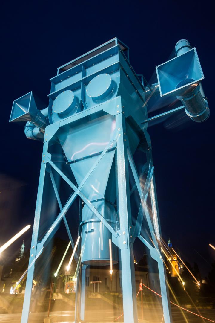 "Dust Eater" is an artistic proposition that can be fulfilled on many levels. Targeted at various age groups, it has become a fully-fledged proposal by an artist who finds inspiration in technology and natural sciences. The "Dust Eater" that devours pollution is the result of an intriguing transformation of an industrial device into a work of art, a techno-spirit totem of the industrial era. The very gesture of this transgression is a post-futuristic manifesto postulating the value of a critical look at the impact of civilization on our environment and on ourselves. The project combines art with technology, abstract thinking with utilitarian aspects and aesthetics with functionality.