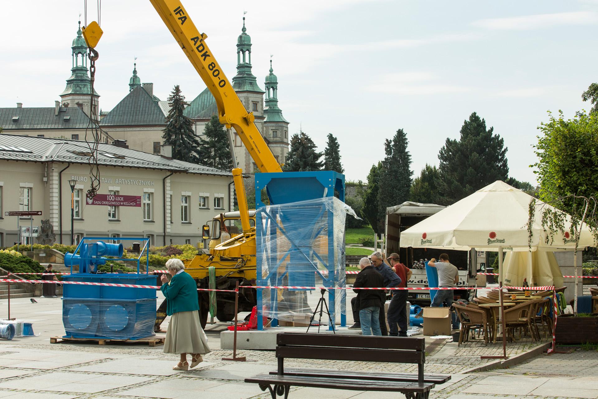 The object is massive (appx. dimensions of the object are 6.5 m high, 2.5 m wide and 2 m deep), colorful and highly visible. The part of the concept was to complete the installation process of the „Dust Eater” directly on the site prior to the opening. The work was being assembled at the Artist’s Square (Plac Artystów) and was available for observation by city residents. It naturally preceded the opening of the exhibition and the beginning of the "Dust Eater" activities.