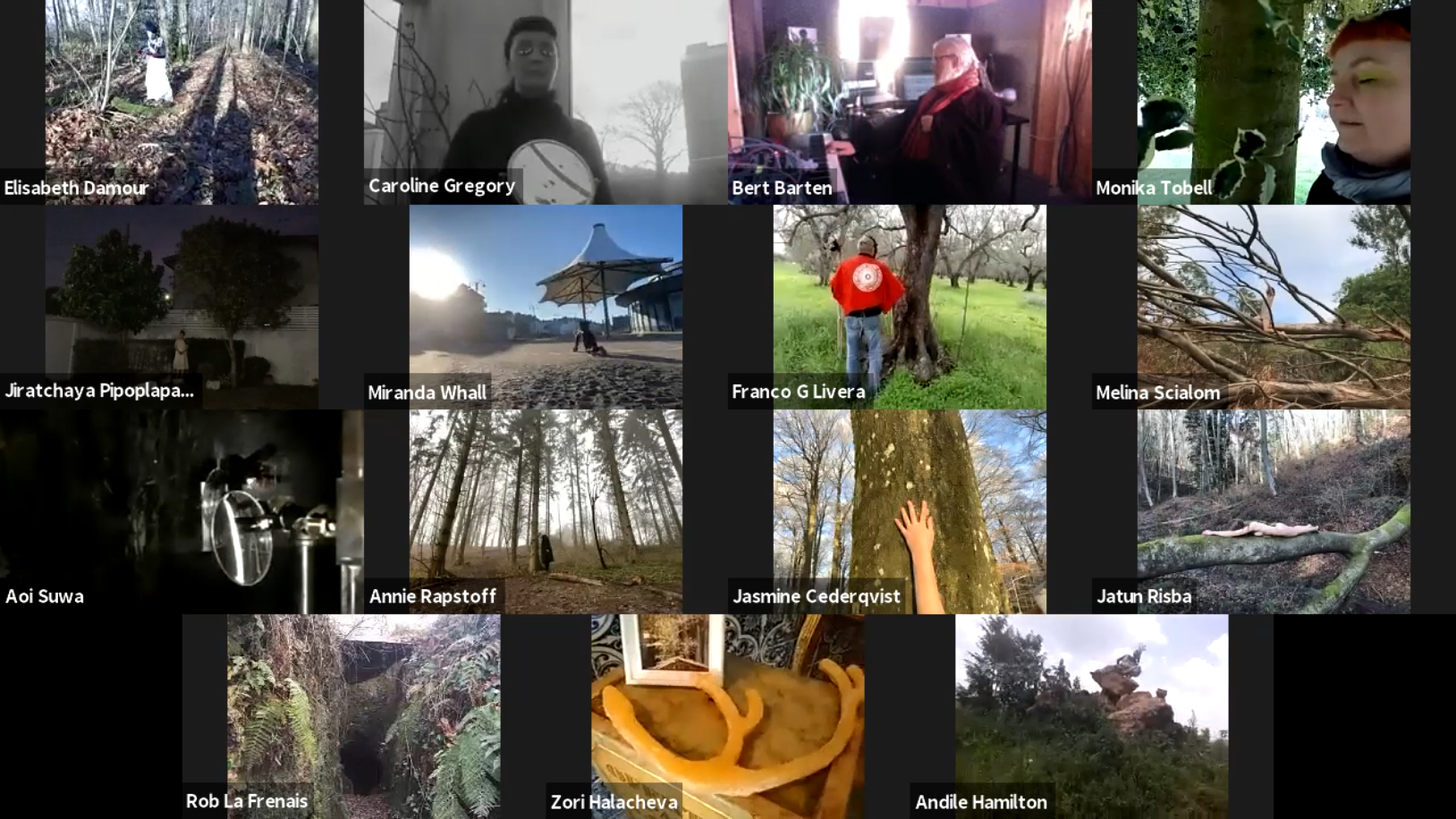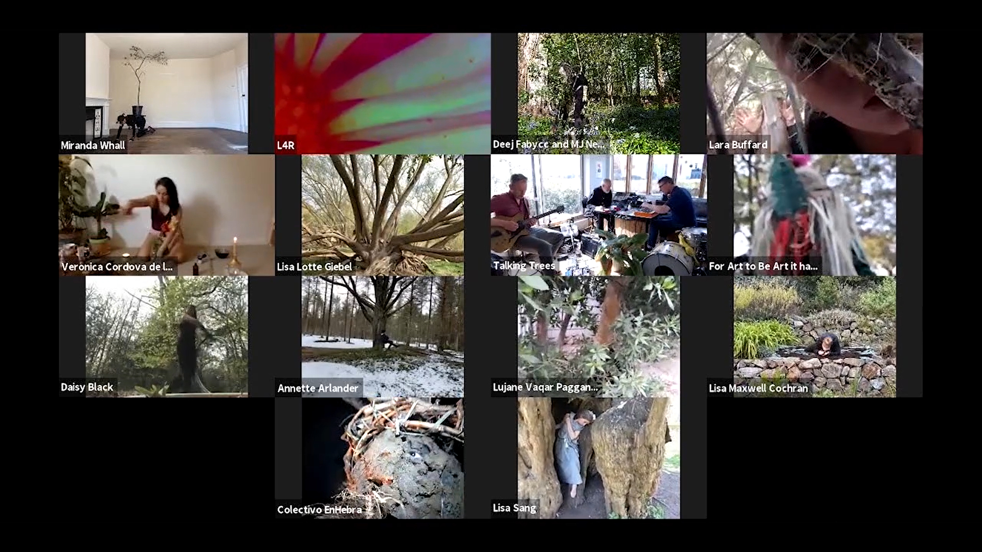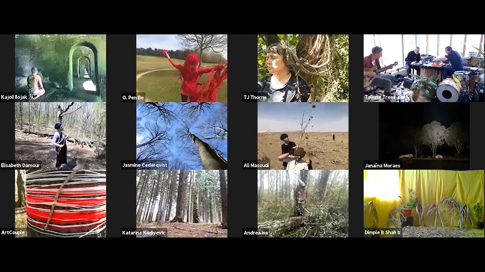 We aim to offer audiences a smooth online experience of multiple artistic actions in diverse ecosystems being visible all at the same time, alongside an expressive live soundscape. We present the performance in ‘gallery view’ highlighting the unity of beings across the world and synchronicities of simultaneous activity - a departure from individualistic art presentation. The screen is filled with trees and landscapes in different continents, creating a microcosm of planetary life. The audience can pin selected artists and focus on a chosen work or action, gaining interactive agency.