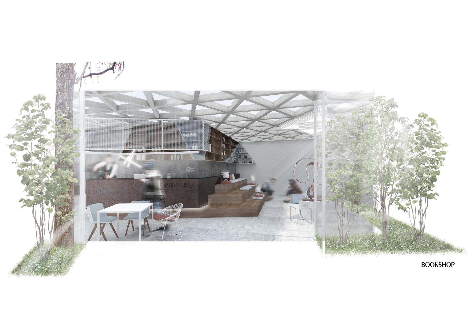 Sun analysis and planting: In regard to the morphology, tinier “cracks” are designed for contributing natural upper lightening. The existing trees are placed in that cracks, inserting nature in the interior spaces.