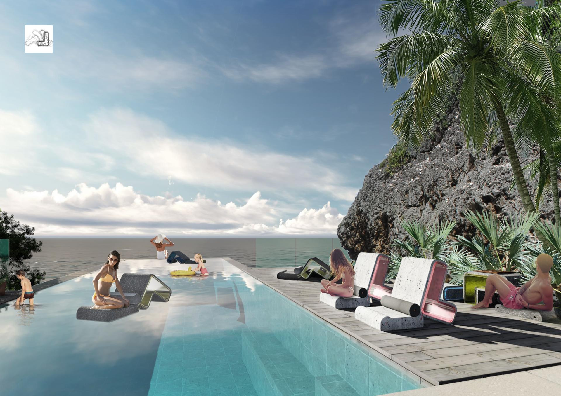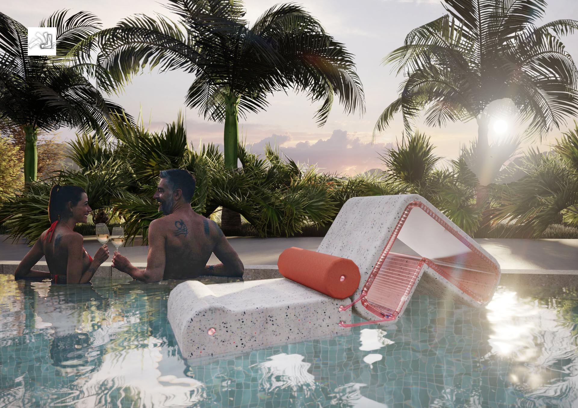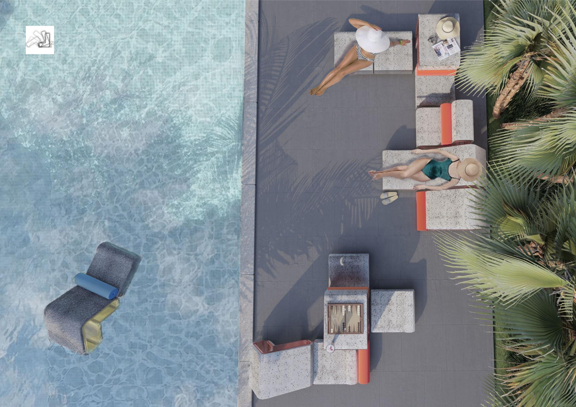 The furniture is designed for modular use as well. It could form groups of seating and provide different activities like working, eating, playing games, sunbathing or just relaxing.