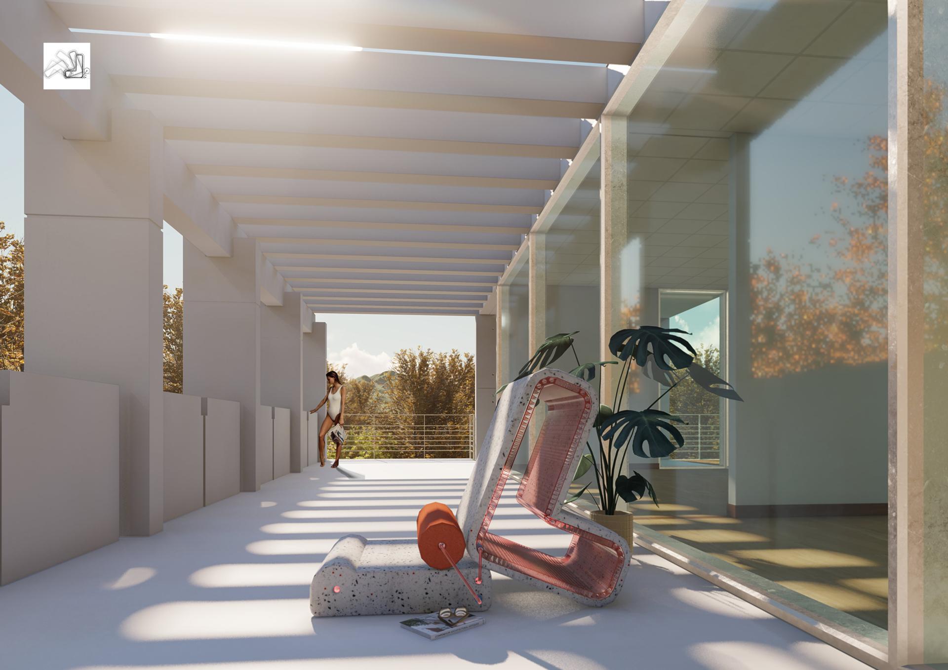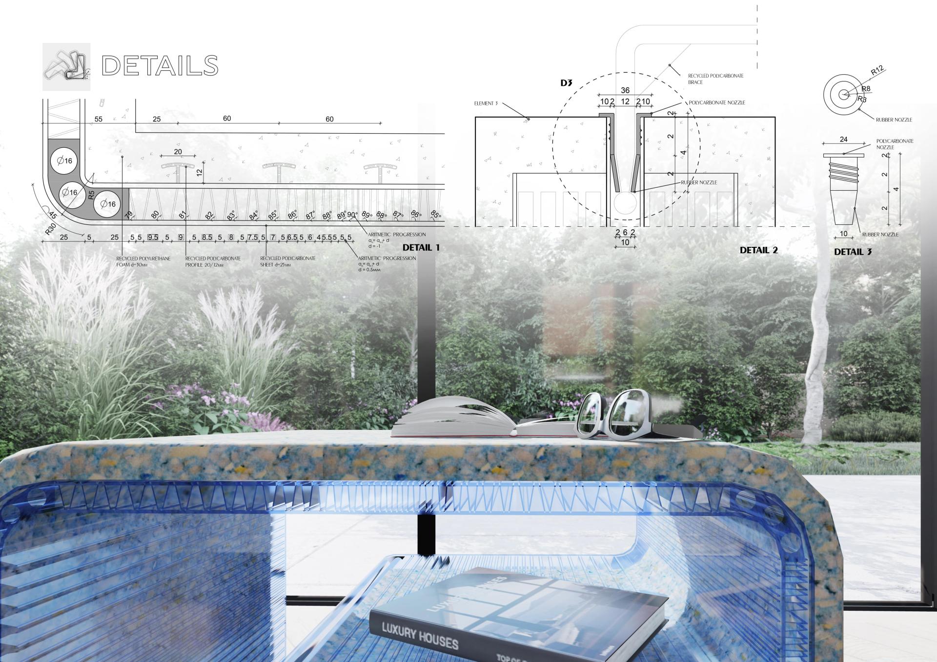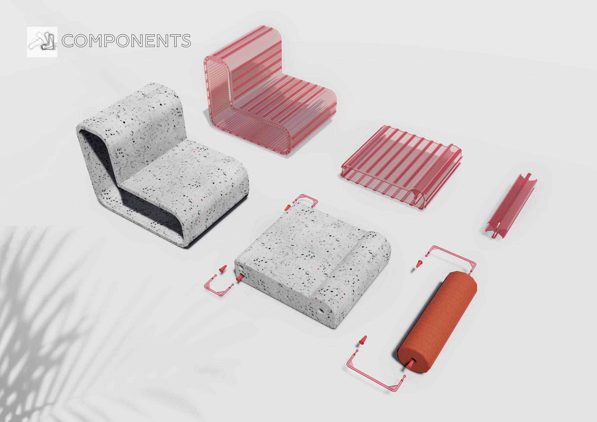 The furniture is designed for modular use as well. It could form groups of seating and provide different activities like working, eating, playing games, sunbathing or just relaxing.