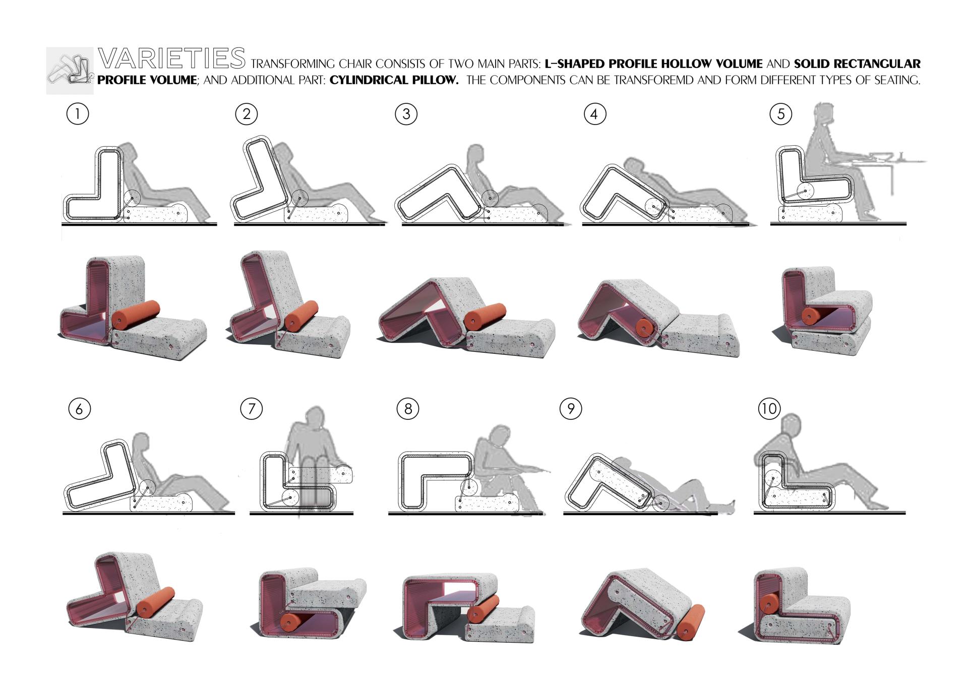 Transforming chair is furniture completely made by recycled materials - polycarbonate sheet and polyurethane foam. Transforming chair consists of two main: L-shaped profile hollow volume and solid rectangular profile volume; and additional part: cylindrical pillow. The components can be transformed and form different types of seating.