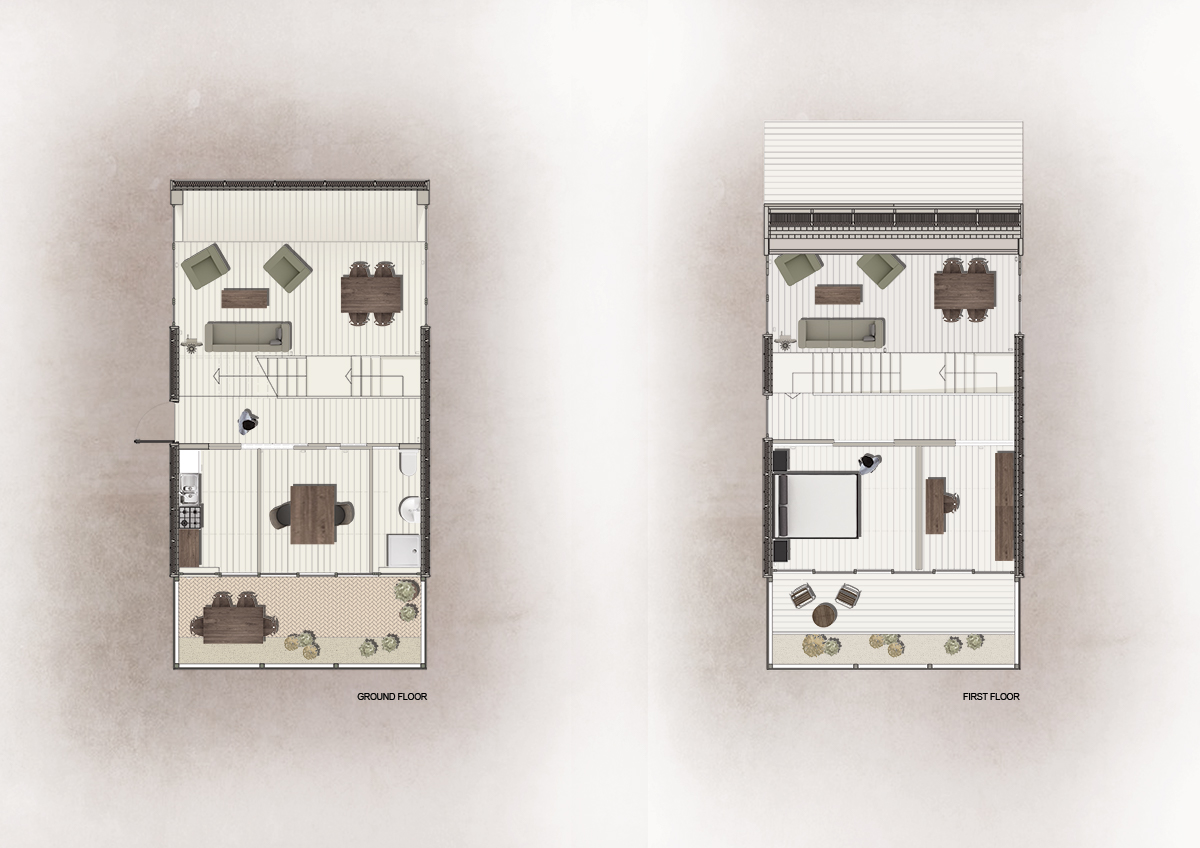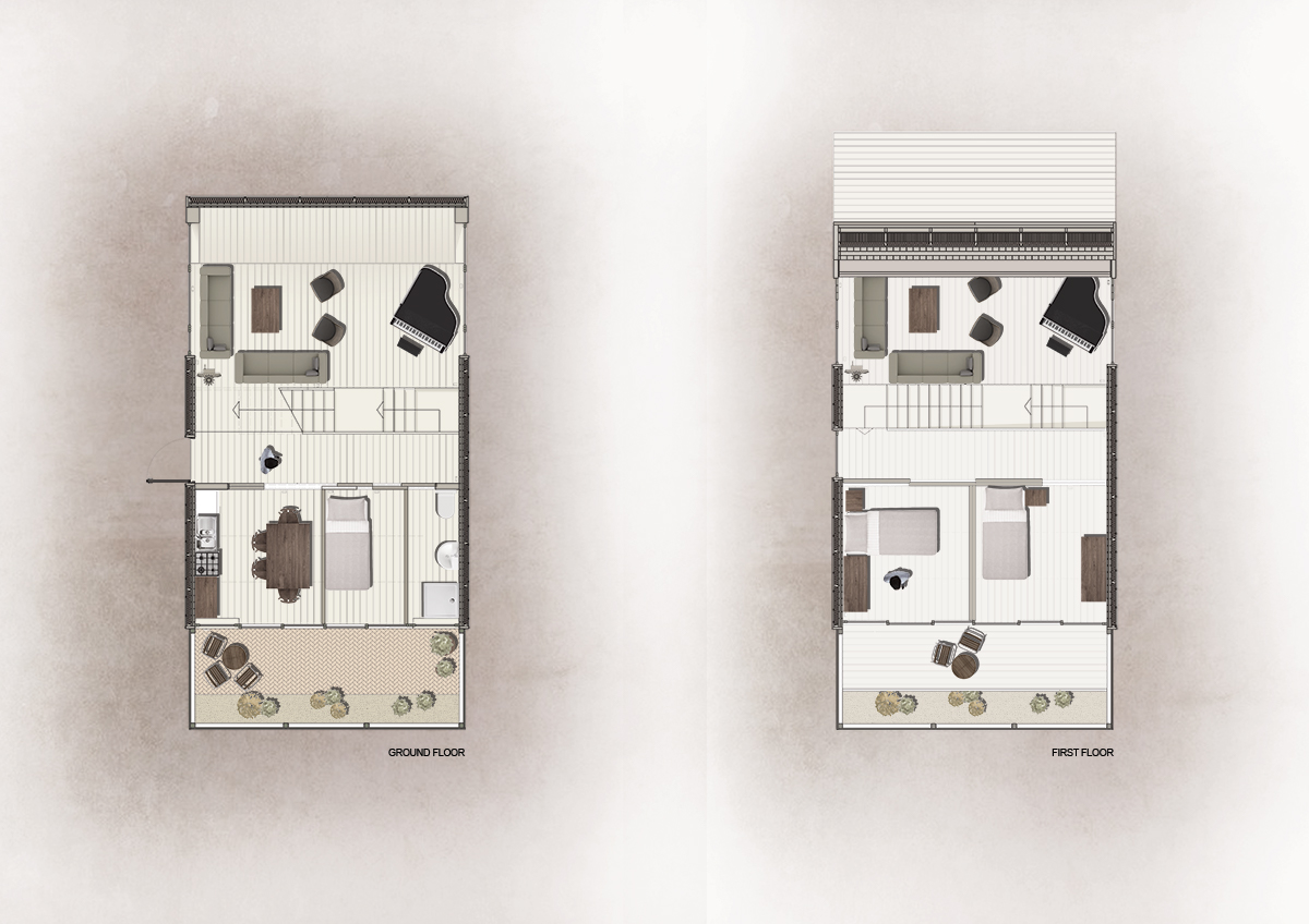 This house is built out of wood, which is left exposed both in the exterior and the interior. This way, a really warm and natural ambience is created to make everyone feel welcome and calm. A small space for a garden is provided at the back of the house, giving the oportunity to have nature even more present in their everyday life. Big windows and openings let natural light in and the openess of the space provides a sense of spaciousness. Adding the fact that the house can be fully personalized gives the opportunity to add any personal aesthetic (since everyone has their own definition of it) to the house, making it truly a home.