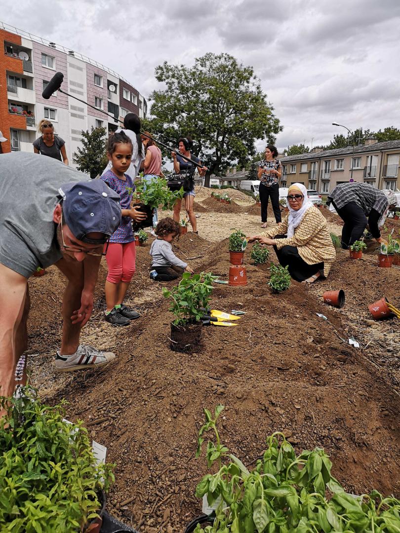 2) Developing an agricultural project following virtuous models like permaculture : In line with the agglomeration's efforts to promote local distribution channels and virtuous production models, we designed the community garden to encourage contact between the inhabitants and nature. A 200 square-meters mandala garden and 6 raised planter boxes were installed on the former wasteland, where vegetables, fruits, and aromatic herbs.