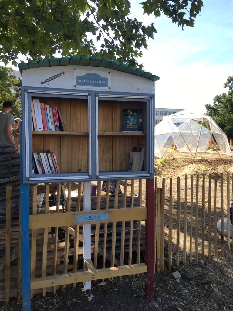 4) Reusing, recycling, reducing wastes : An automatic watering system and a rainwater collector have been installed to maintain the garden. We also built a public bookcase to encourage other forms of exchanges between neighbors.