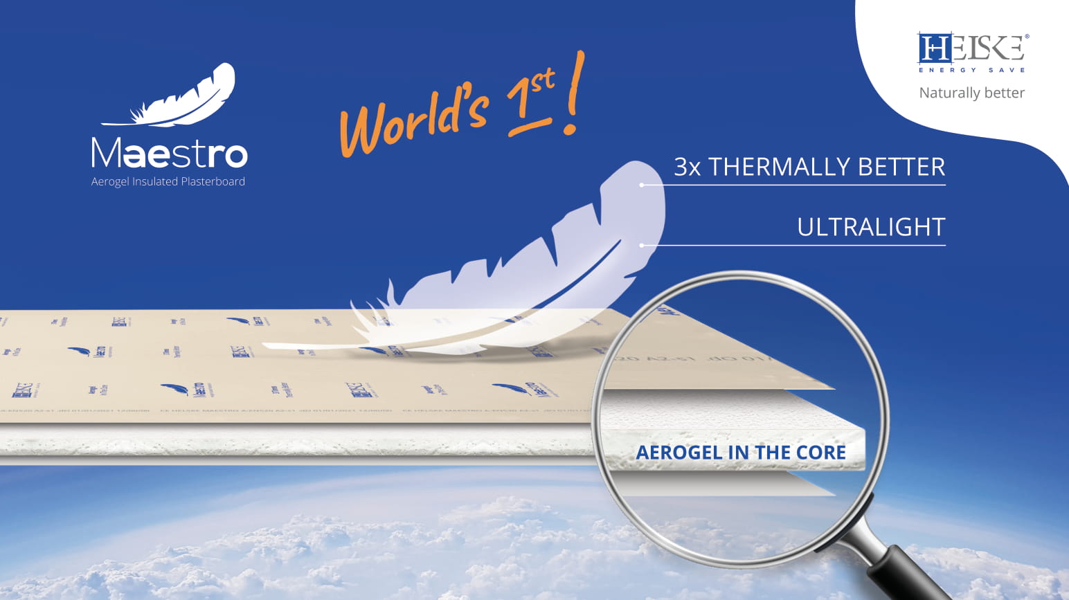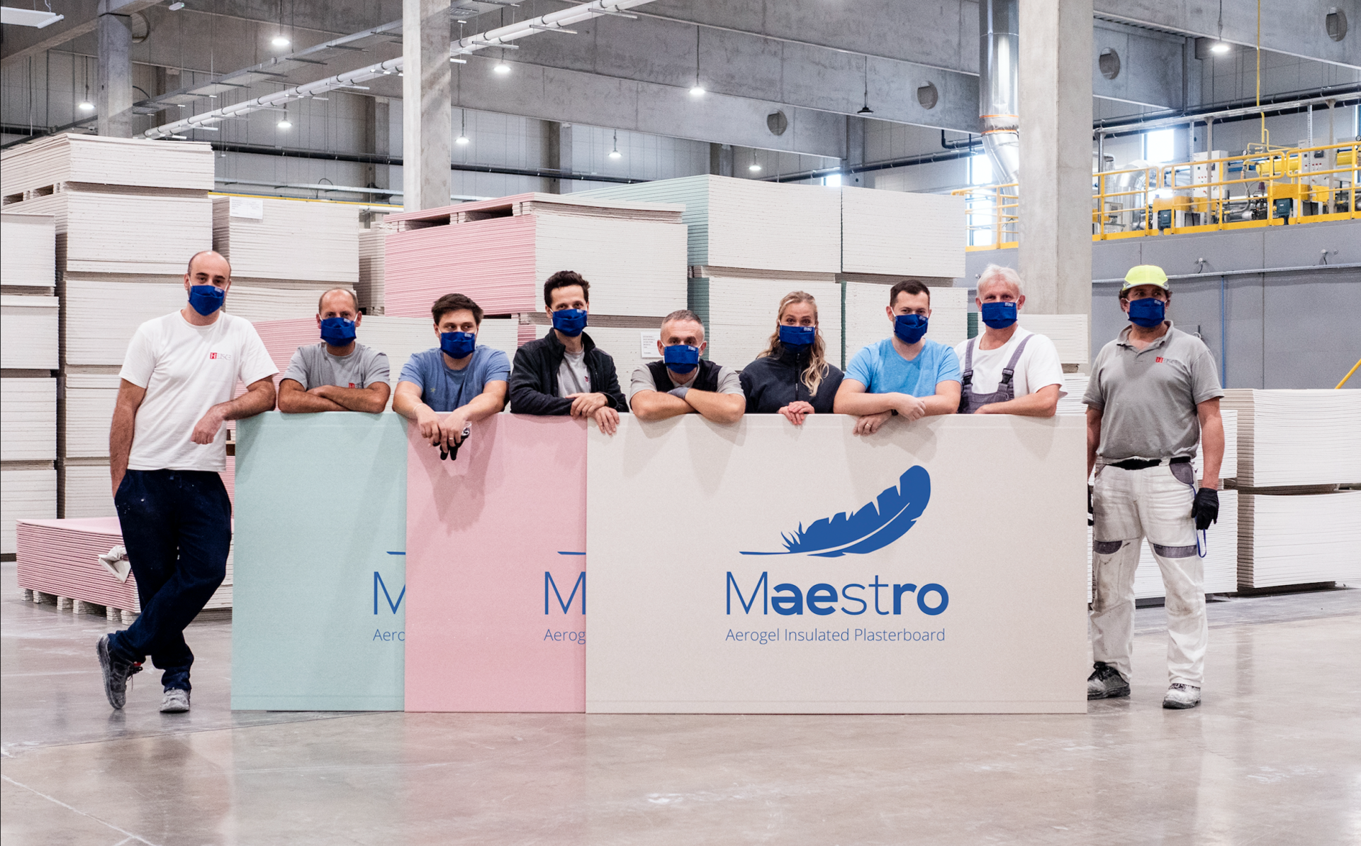 The building industry is considered to be a major polluter. Plasterboards are a widely-used multi-billion-euro business. By infusing aerogel, the number one thermal insulator in the space industry into gypsum plaster, we developed a new generation of "Maestro plasterboards" with special properties such as: low thermal conductivity and lightweight. These features facilitate thermal comfort, energy and space savings, as well as lower transport emissions. With a sector this large, every bit helps!