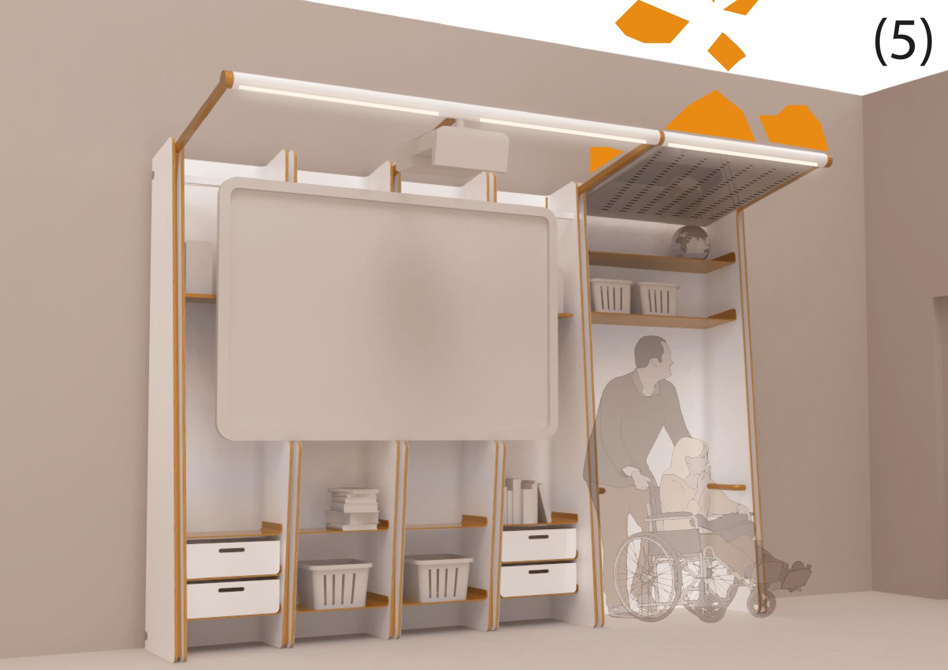 One of the major problems identified in the state of the art of earthquake protection products (image 4) is that no life-saving solutions have been developed for people with particular disabilities. The S.A.F.E. project has investigated new performance aspects of inclusiveness for this furniture specialized in self-protection. In particular, one of the modules of the S.A.F.E equipped wall was developed to guarantee protection from the earthquake for students with motor disabilities. In fact, in addition to avoiding the possible overturning of the masonry walls, the new concept of the equipped wall has a module consisting of a shelter resistant to vertical loads and structural failures, where the disabled student finds shelter and protection space in the event of an earthquake emergency (image 5).
