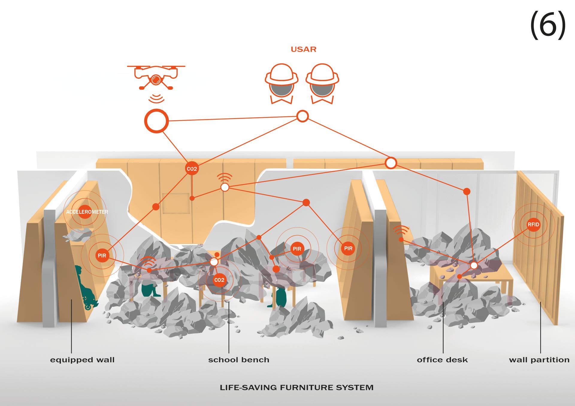 The challenge for scientific, technological and industrial research has been to innovate, under a structural perspective, the design of furniture that are used in the schools and offices and transform them in smart passive-safety systems that can contribute to the protection of life through the integration of sensors for management, localization and retrieval of people in the event of an earthquake. Through a multidisciplinary technical-scientific approach to the innovation and the sharing of different know-how within the public-private partnership involved in the project, has been developed a new furniture system for safer schools, especially in building contexts vulnerable to the earthquake, such as schools in historic centers. The core of the furniture system consists of a new concept of an anti-seismic school desk, a new concept of equipped wall and partition wall. Each concept works as a single protection unit and through mechanical and digital interconnection systems can generate a life-saving system able to increase the level of protection for the school.