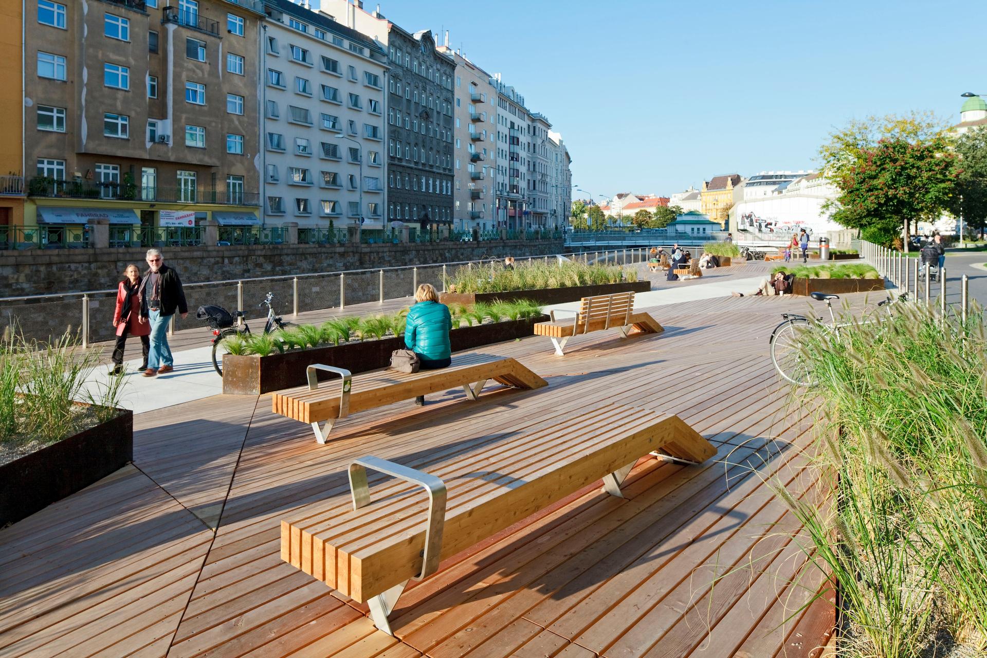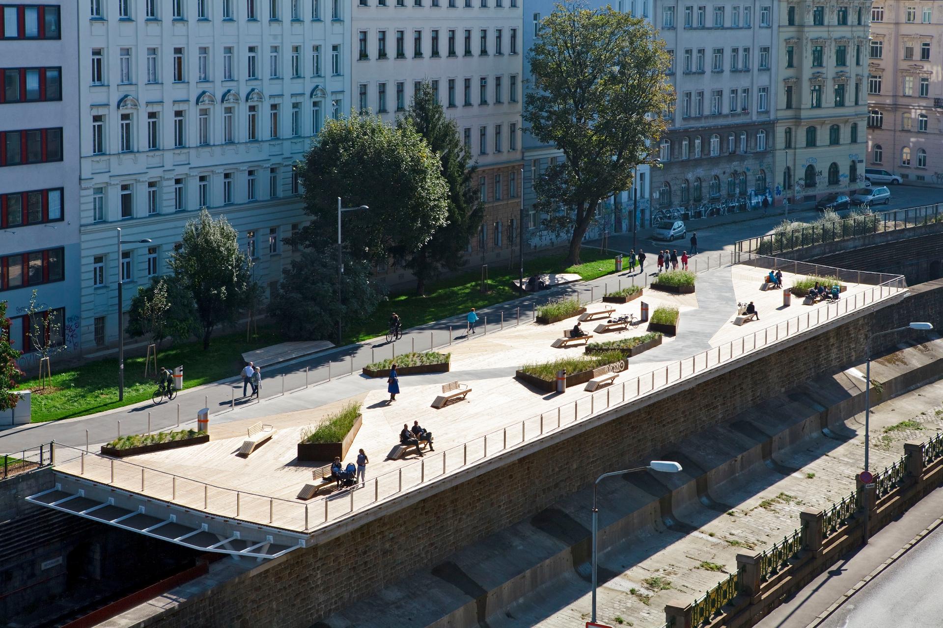 “A wood surface with integrated ramps folds into a terraced landscape, creating – despite the surrounding traffic – a place of rest in an environment that could hardly be more urban. The supports, the concrete slab and wood cladding are part of the holistic design that also includes benches and planters. In fact, the design elements and materiality – which are quite contemporary and sophisticated – invite public use, foster a positive connection with nature and water and conform to the technoid charm of the city railway designed by Otto Wagner: the beauty of utility”. Manuela Hötzl, architecture critic and writer, ORIS.
