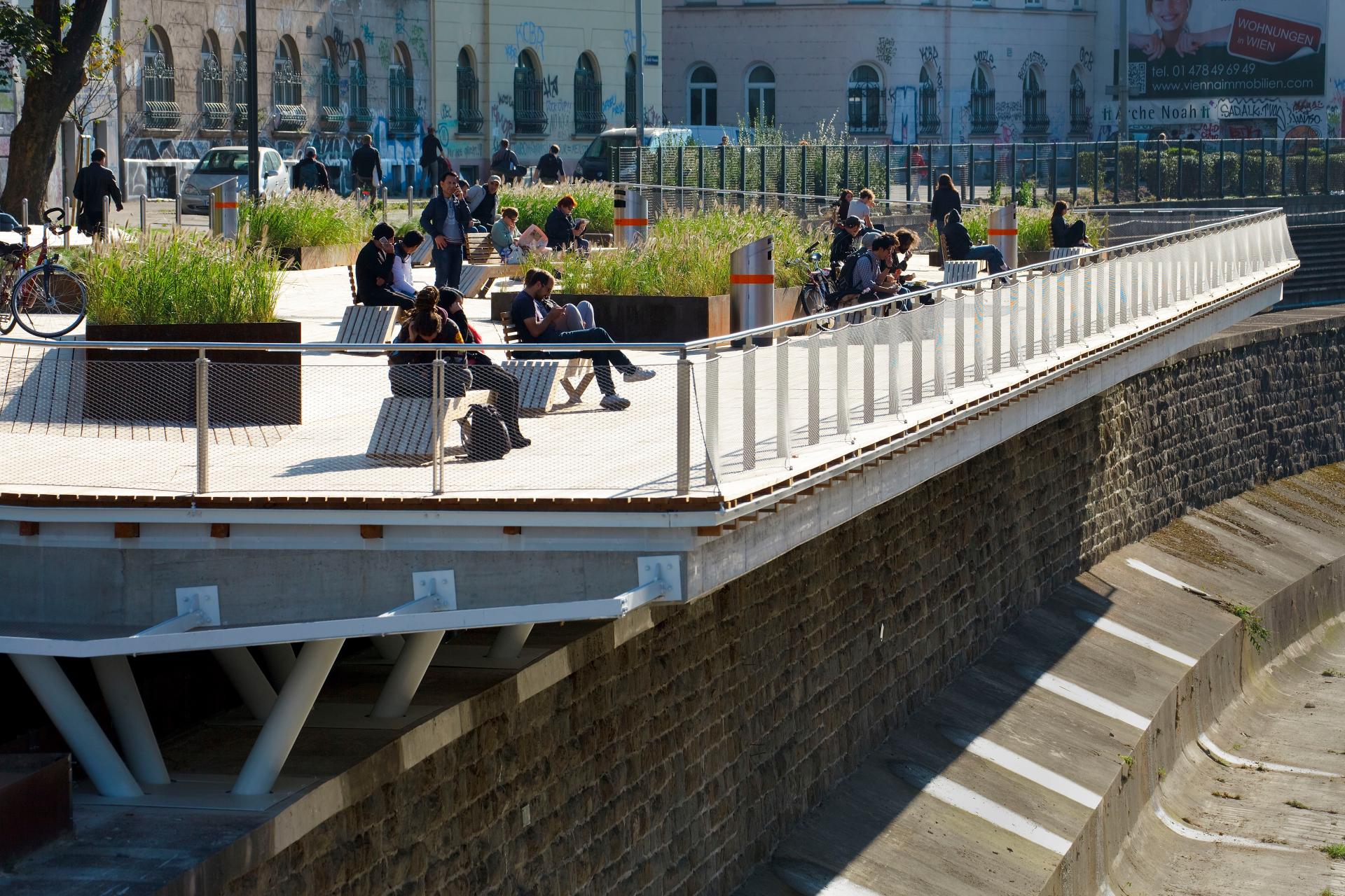 A growing city like Vienna, requires more public open spaces with an attractive atmosphere for urban activities for its citizens . Vienna is one of the world’s greenest cities, however, the green spaces are unequally distributed in its 23 districts. The Vienna Valley Terrace is specifically designed as a response to the severe lack of public open space in the dense central city. The terrace and the footbridge over Wien River connect two districts and bring the river closer to the urban environment. The terrace is a catalytic project in the Vienna Valley Urban Development Plan and was the first of four public terraces conceived for the entire 14 km length of the river valley.