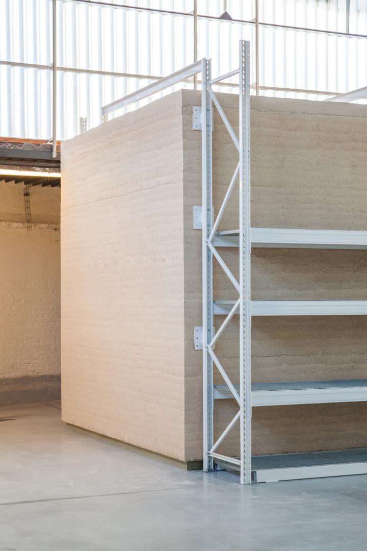 This building is an example for what we call radical sustainability. Only 3 techniques are used for the superstructure: ‘Stow’ pallet racks, wood plating and hempcrete. A pallet rack system is a steel prefabricated, standardized, industrial system, used in the logistic world. It can be reused (de/remounted) many times and has a long lifespan. Wooden plating acts as interior finishing and as lost formwork for the subsequenl packing of these walls in hempcrete as an outside insulation, running from wall to wall over the roof.