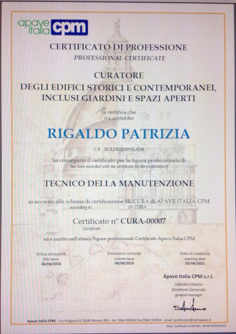 The certification project, in the context of maintenance and monitoring, was born from the need to protect, enhance existing buildings and the professional skills involved in a more performing, more sustainable and more strategic multidisciplinary context to give concreteness and visibility to what today remains unexpressed (see the italian Unique Code of Cultural Heritage, Art.29). This approach favors the strategic and financial planning of interventions by offering project management models where the variable of time allows a correct protection of the value of real estate assets. The certification of professionalism enhances the experience acquired in the field, giving specificity to already operational professionals, defining reference quality standards. A model of a conceptual and systemic approach to maintenance that converges in the figure of the Curator. Our sustainable structured model of Maintenance Management through Care and Certified Curators of historical and contemporary buildings, gardens and open spaces is based on the cognitive, ethical, economic and social innovation of professionalism. The drafting of the model of reconnaissance and economic planning of maintenance interventions, starts from the analysis of prevention of the state of affairs (already at the planning level) drawn up by the Certified Curator. The collected data allow to create and define the ad hoc model of maintenance, management and coordination of the asset, which takes into account the time frame in which the cure is evaluated, the expectations with respect to the authenticity and the devaluation of the asset, the cost of productive activities, the arrangements for agreements with partners that complete the process (see insurance, etc.). The Curator of Maintenance and Monitoring of historic buildings, contemporary, gardens and open spaces is a new certified professional figure born from the project of the Chiave di Volta studio in collaboration with Apave Italia (Apave Group).