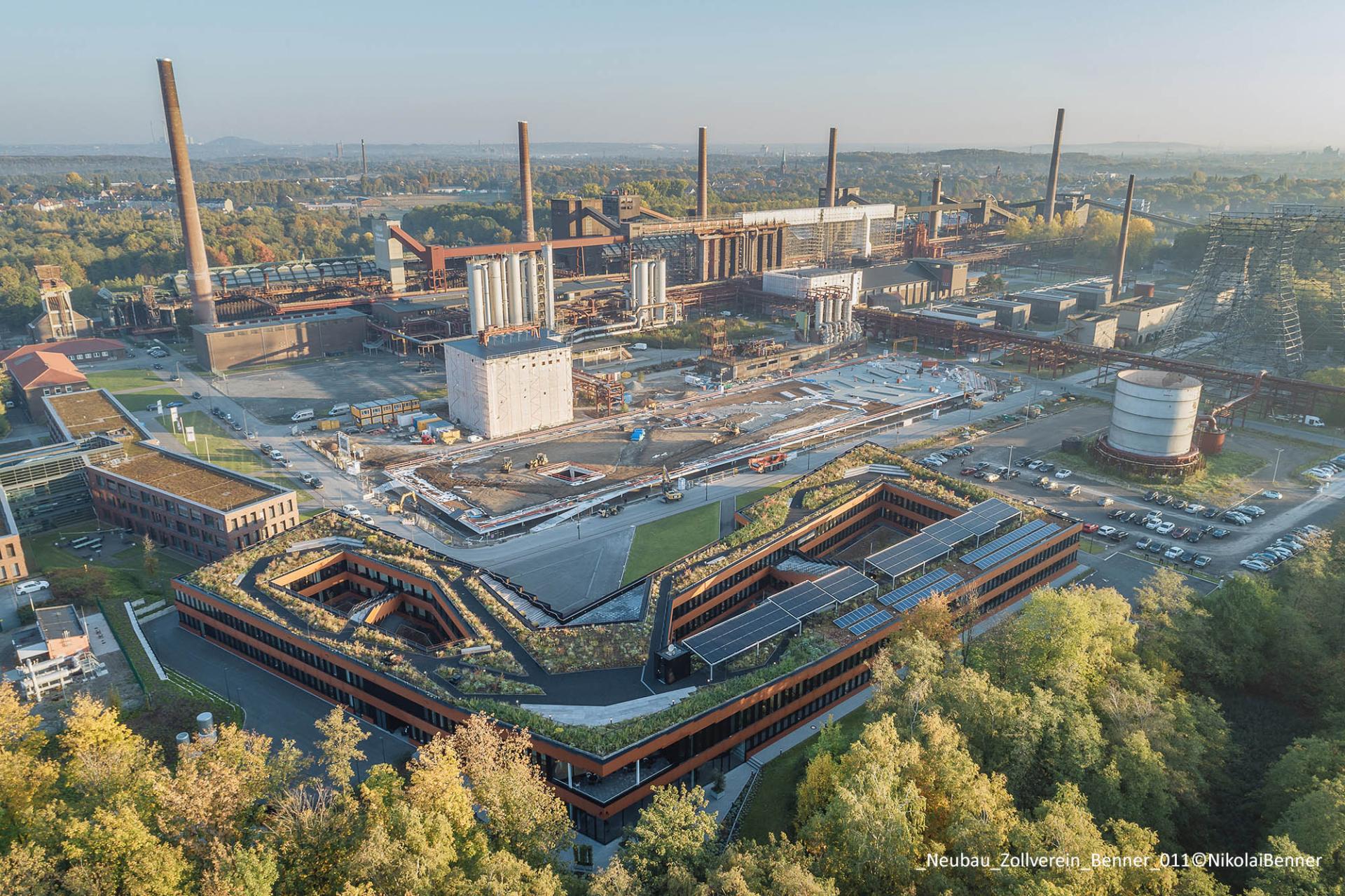 The pilot project “New office building” is located in Essen, Germany, directly on the UNESCO world heritage site of “Zeche Zollverein”, a former coal mine industrial complex. The project is intended to be a pilot for renewable design with a special focus on the Cradle to Cradle design principles focusing on transformable and recyclable design, healthy materials and the use of a “Material Passports”. The multi-purpose roof landscape compensates for the ground area occupied by the development.