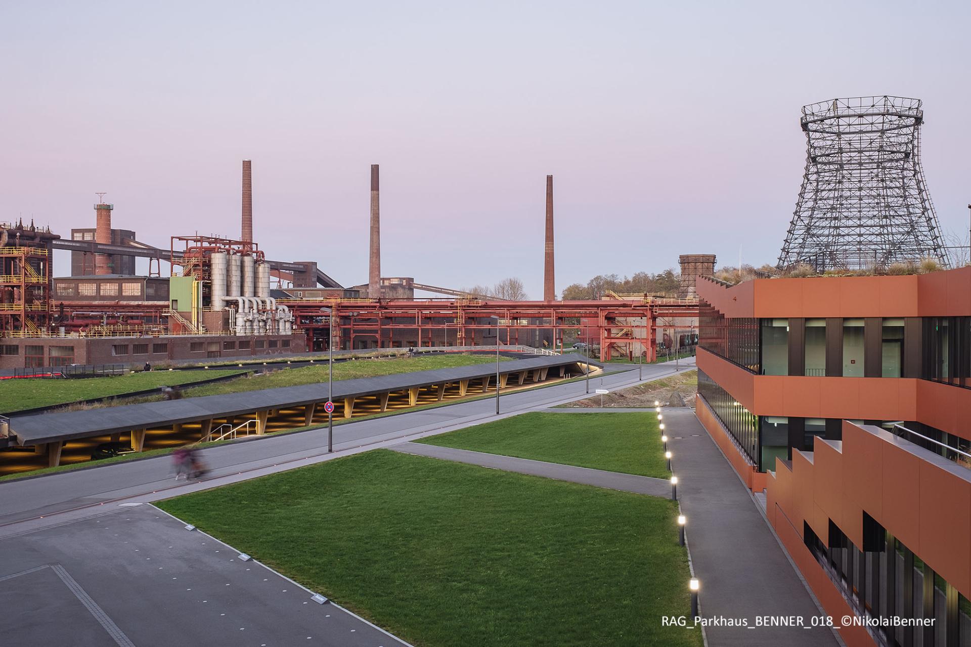The new administrative headquarters of RAG Stiftung and RAG AG is located at the UNESCO World Heritage Site Zollverein in Essen. It is the first project in Germany that has implemented comprehensive measures inspired by the cradle-to-cradle principles (C2C) [see [(c2ccertified.org), ww. epea.com]; moreover, it has received a DGNB certificate with the highest Platinum rating. The accessible planted roof compensates for the building footprint and returns the covered area back to nature and mankind. The objective was to create an office building with highest sustainability standards which provides adequate space for the users and a structure that is embedded in the listed World Heritage complex in a sensitive way.The choice of the location on the originally industrial grounds of Zollverein means that priority was given to the recycling of the brownfield site of the former coal mine. On basis of the C2C-principles four added value ideas were defined for the building: 1. positive for human environment, 2. building as a power plant, 3. healthy + flexible working environment and 4. building as material bank. The closed-loop building generates energy, functions as a material bank and meets the highest requirements in terms of indoor air quality. The roof garden not only increases the biodiversity for flora and fauna and affects an improvement of the micro climate and air quality, it also functions as a space for the building occupants to linger, relax and communicate. Within the EU research project ‘Buildings as Material Banks’, the building was chosen as a pilot project and the materials used were documented in a material passport. This means that materials and components have not only been chosen for their health and environmental aspects but, more than anything else, for their circular economy strategies with the effect that the quality of raw materials is retained until the building reaches the end of its lifecycle and then functions as a resource bank