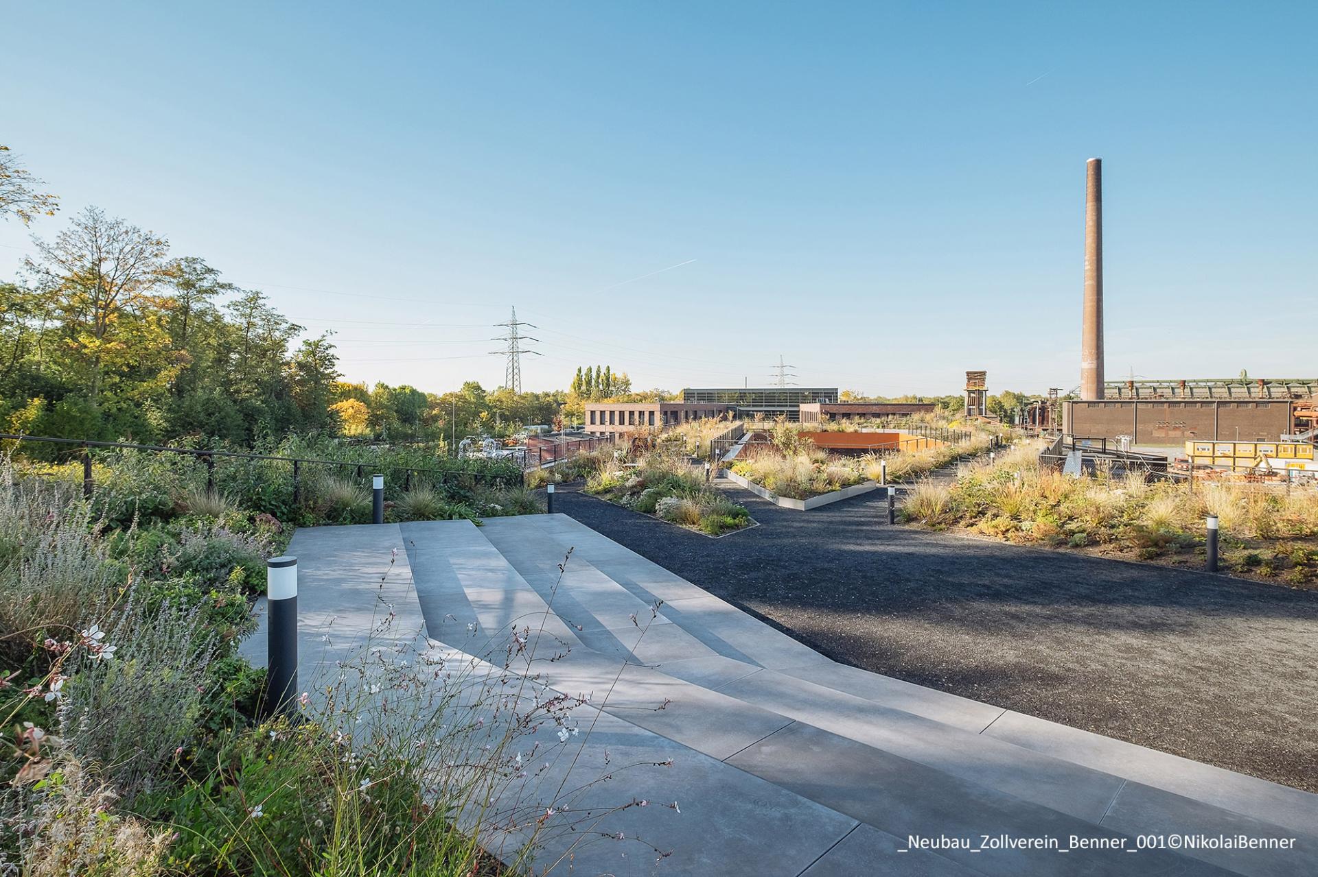 The accessible planted roof landscape compensates for the area sealed by the development and offers a valuable space with an identity of its own at the intersection between the industrial cultural and natural landscape. The desire to give some of the nature back to the developed land has been achieved by creating an intensively planted roof. Mediating between the cultural and natural environments, the outcome is a green zone that in itself has become part of the landscape. Raised areas above the canteen and the corner rooms function as stepped seating areas; paths and terraces make the exterior space accessible. In between, a variety of shrubs, small bushes, a herb garden and a photovoltaic pergola as well as nest boxes for bats clearly refer to the issues of energy generation and use of natural resources. Consequently, the building offers its occupants high-quality exterior space and, at the same time, has a positive impact on the microclimate and biodiversity of the location.