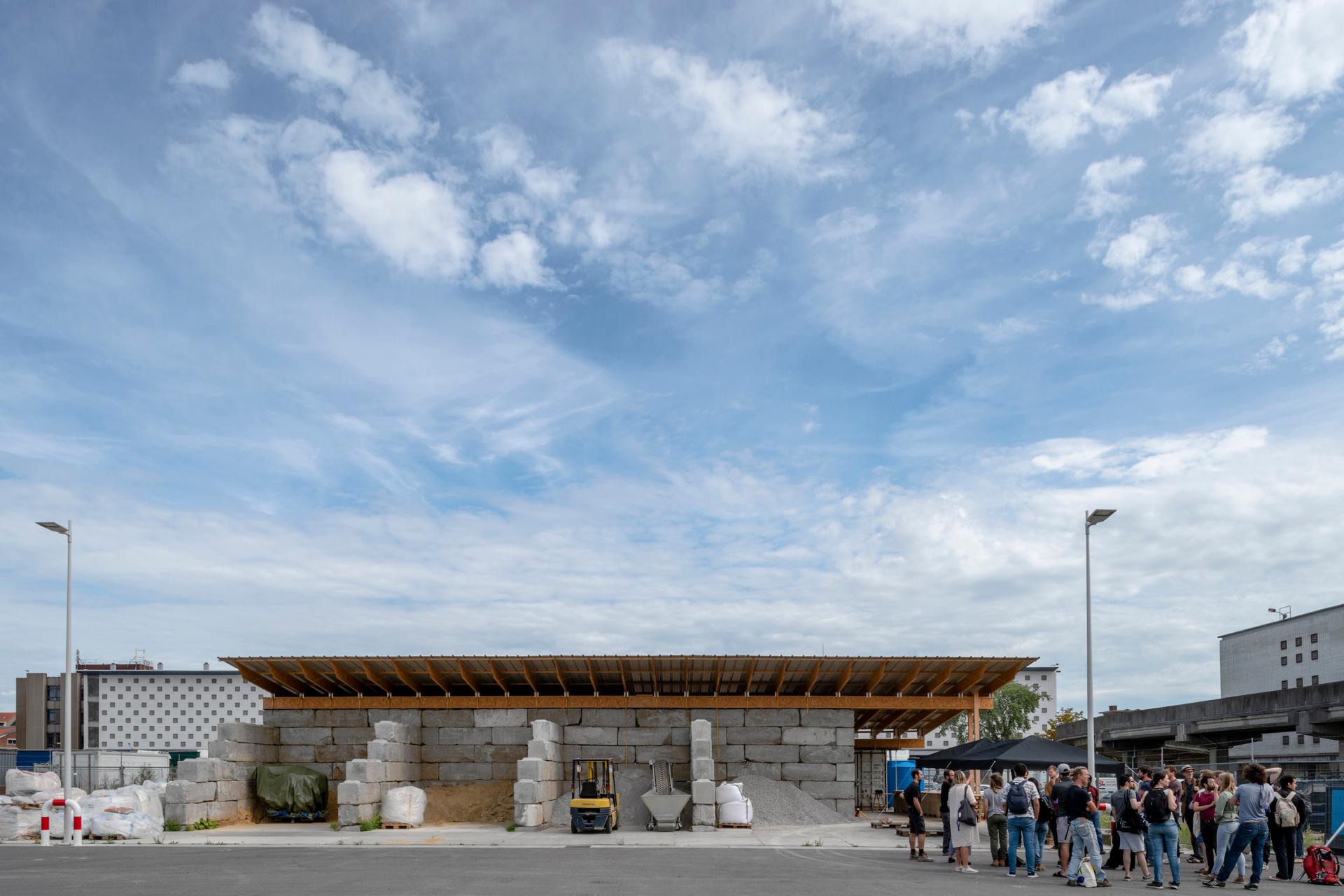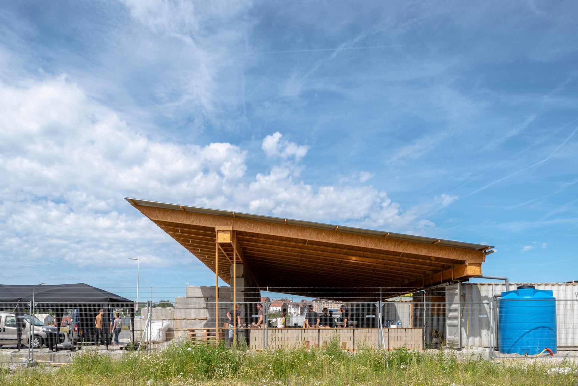 When BC was looking for and affordable production site in Brussels, it was forced to turn towards an unoccupied plot in the Brussels Canal Zone has to offer – a sea breeze, industrial hangars, trucks riding in and out, and leftover space. In the midst of this eclectic association of nature, industry and materials, BC realized a small, somewhat robust but intriguing building: a storage and production site for materials. Built as a totally demountable structure, the hangar is made almost entirely pf circular materials. Second-hand concrete tiles, placed on a bed of construction waste, make up the floor. Two second-hand containers function as load-bearing points on which the roof is positioned. Second-hand Legio building blocks were used to create the storage spaces for sand, clay, loam and gravel. Stacked on top of each other, the Legio blocks require no joints, which makes them easily demountable. With straps and bolts, 25 wooden Steico I-beams are attached to the containers and hold up the corrugated iron sheet roof.