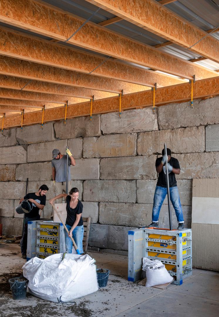 In addition to the materials production, inspiring youngsters (designers, architecture students,...) is one of the most important tasks which take place in the building. At a rammed earth workshop with Case Design young people get the chance to not just get the theory behind earth building but also work, transform and put their feet in the earth.