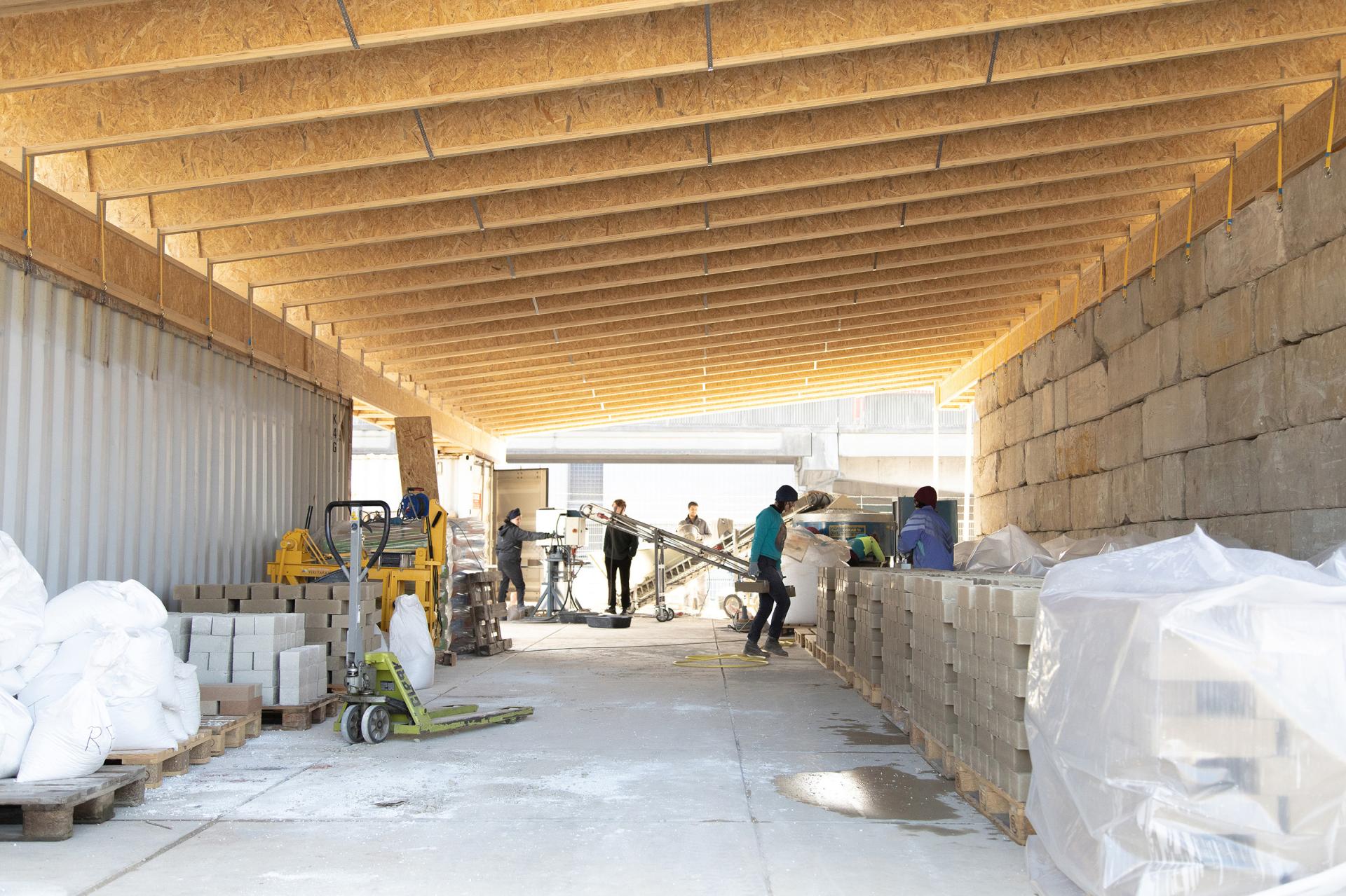 The BC materials production sites has room to store products, contains a drying space and has a polyvalent workshop area where new composites can be explored and tested. Three products are on sale by BC materials in the Brickette (compressed earth blocks), the Brusselier (raw earth plaster), and the Kastar (a clay concrete).