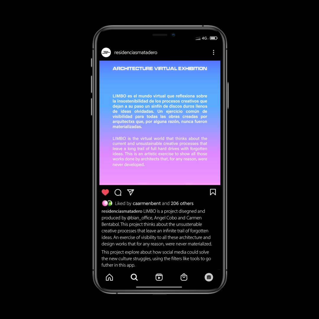 So, LIMBO launched an international open call for creators of architectural spaces built in three-dimensional formats. Once the Open call was closed, an expert jury selected twenty projects. All these shortlisted projects were transform into augmented reality Instagram filters. These filters was part of a virtual exhibition in the social media, in Matadero Madrid. Instagram was transform into a place where these forgotten projects lived, opened and accesible to everybody with a smartphone.