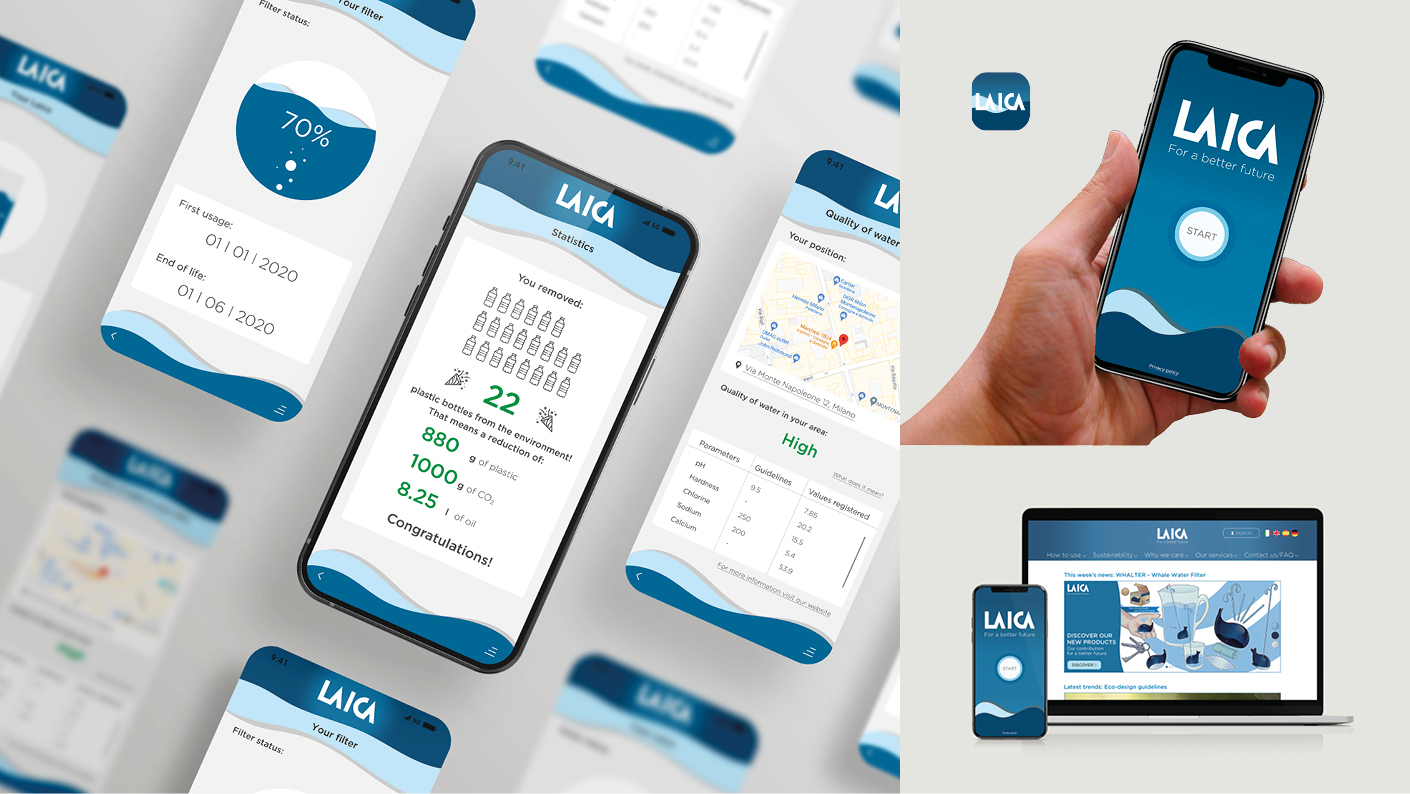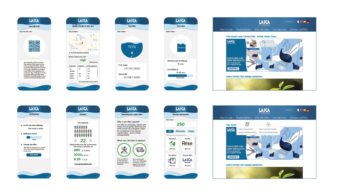 In comparison to the competitors, there isn't only the water filter but also a useful packaging with highlights on what and how to use the product and also important environmental information that tells you the story behind the project through a clear and eyecatching infographic and then also the app contains a lot of useful features to maximize the eco performances of the product and gives other extra information about the sustainable goals of the product (it also encourages you with statistics of how much plastic waste you have avoided because only with the contribute of everyone is possible to stop these problems).