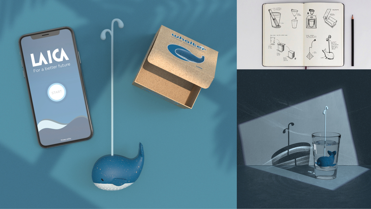 The shape is a simplified version of a whale inspired by the way we have all imagined whales when we were little children because the aim of the aesthetic is to attract and drove the attention towards the product to let people, especially the youngest, know about these environmental problems thanks to the infographic on the packaging and other extra information available by downloading the related app that can bring even more information and it can help to improve the management of the product (for example, when it's the right time to change the filter material and let us know our contribute in reducing the plastic waste measured in plastic bottles avoided, CO2 emission avoided and litres of oil avoided) and also for example know the quality of the water in your area, the filter status, the filtering time, benefit to the environment and how to dispose the filter, there's an integrated service that allows to buy the filter in one click.