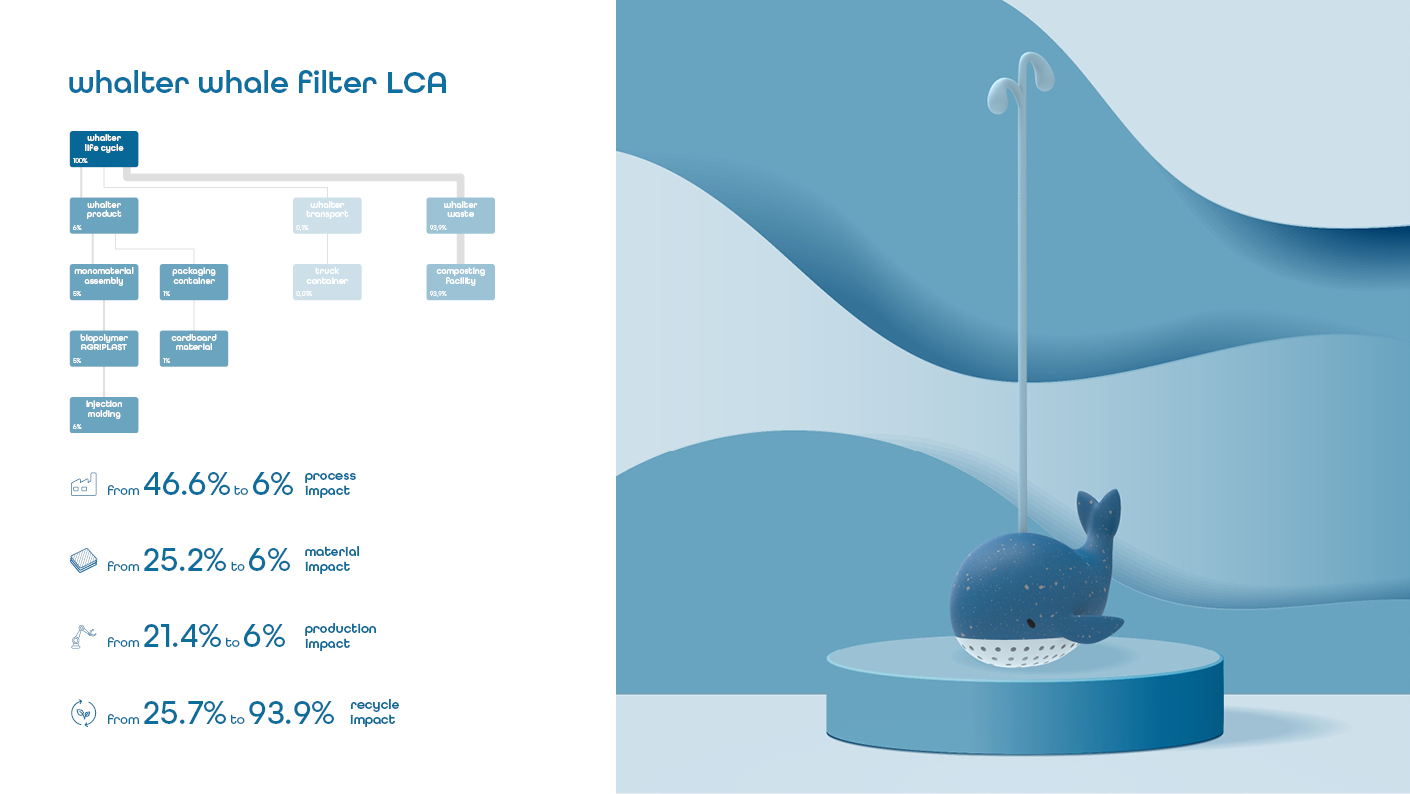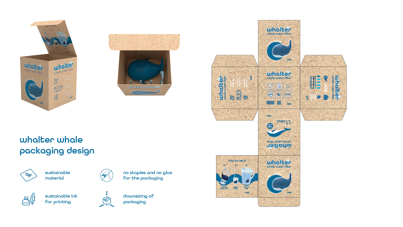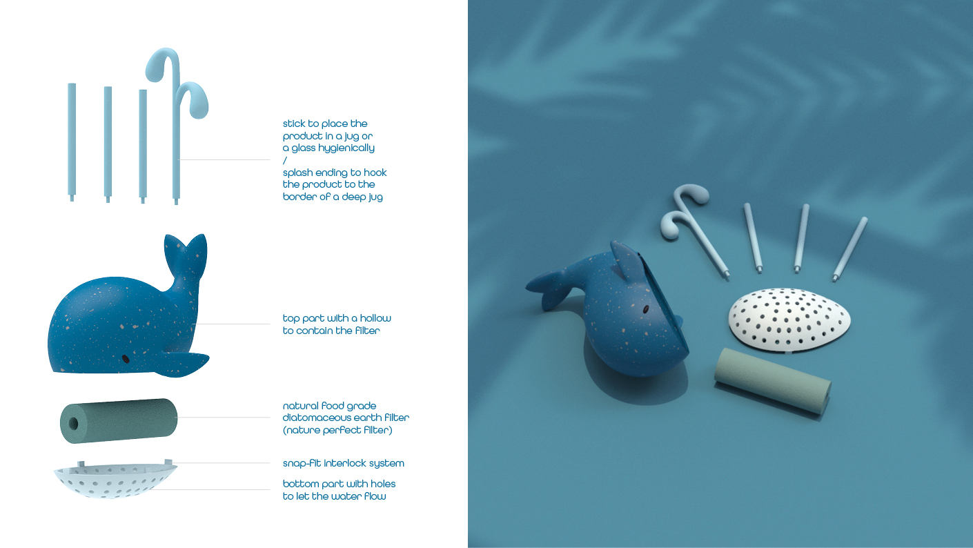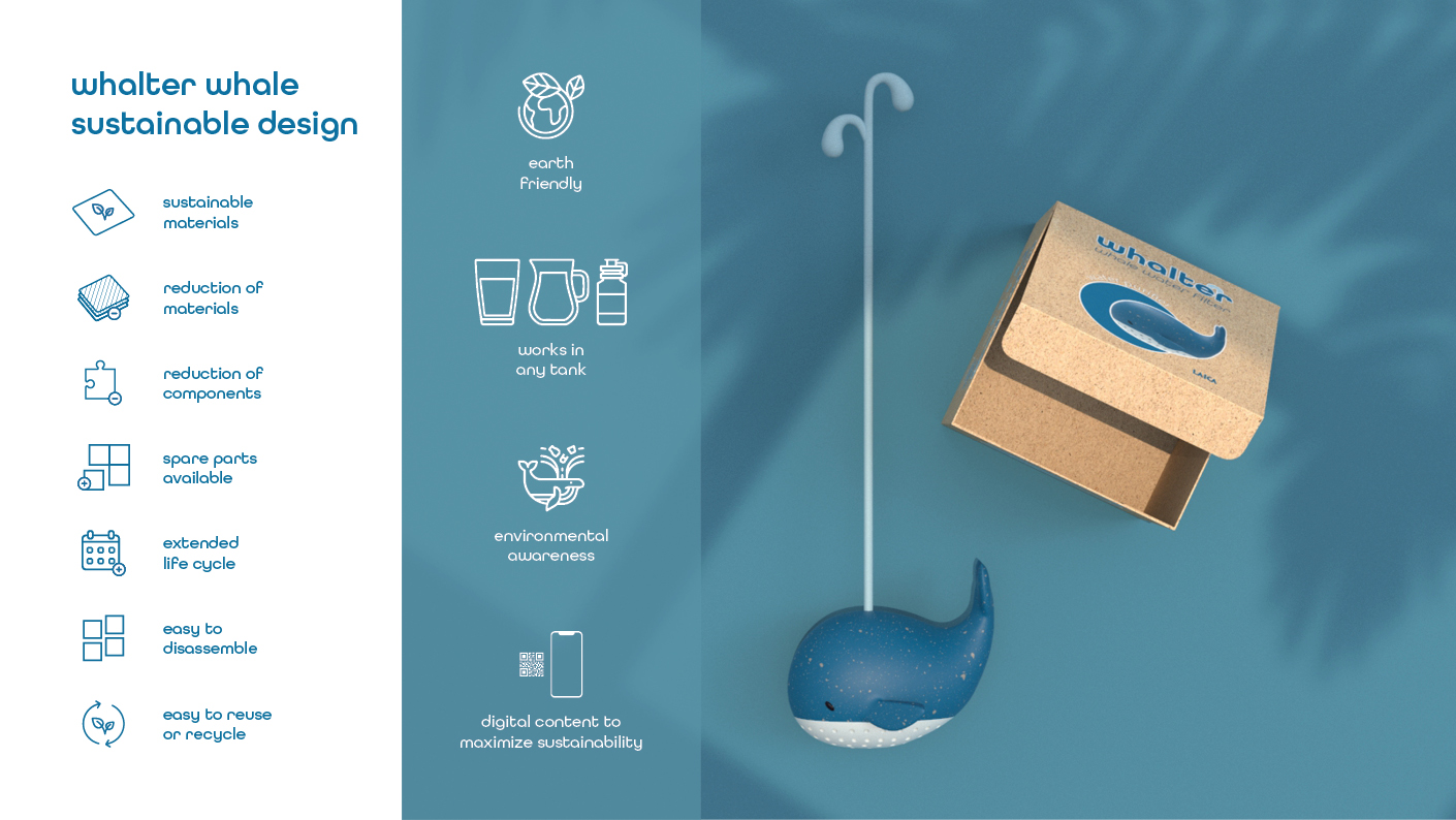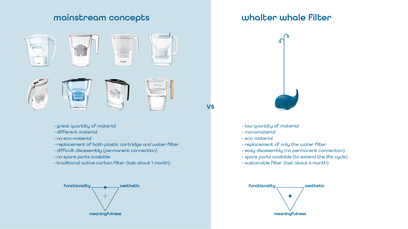 Whalter whale tries to be the most sustainable water filter by following some of the main ecodesign guidelines (less amount of material, sustainable mono-material to facilitate recycling, no need for replaceable plastic cartridge container when you change the filtering material, long life natural filtering system that can last 6-8 times more than traditional active carbon filters, easy to disassembly to facilitate the final recycling, process and production impact is lower in comparison to mainstream products, spare parts available to extend the life cycle) and it is the only product among its competitors that has a particular shape that can create curiosity and so bring information and aware people, especially the future generations in order to raise the awareness towards one of the main environmental problems (plastic waste and global warming).