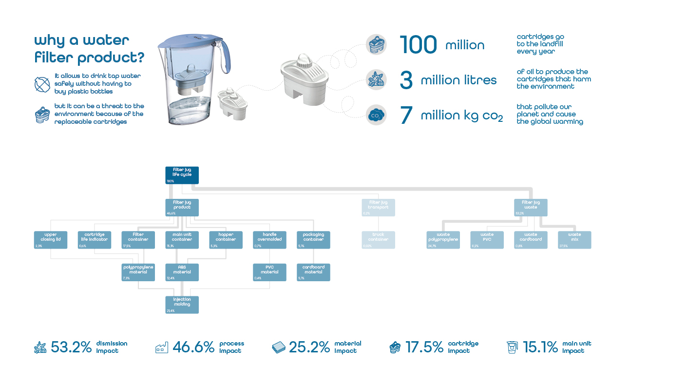 Actual water purifiers are a better solution than single use plastic bottles but water purifiers can be a threat to the environment too, for example, more than 100 million cartridges of traditional water filter jugs go to landfill every year that is a big number considering that water filter system are not widely spread today and so there's a lot of space for improvement in that direction and also on the design of those product (they are made of a lot of parts with even different materials and for example, mainstream water jugs have big handles that come out of the product that is an unnecessary waste of material since the handle can be integrated also directly in the main body of the jug, but the biggest problem remains the replaceable cartridges)