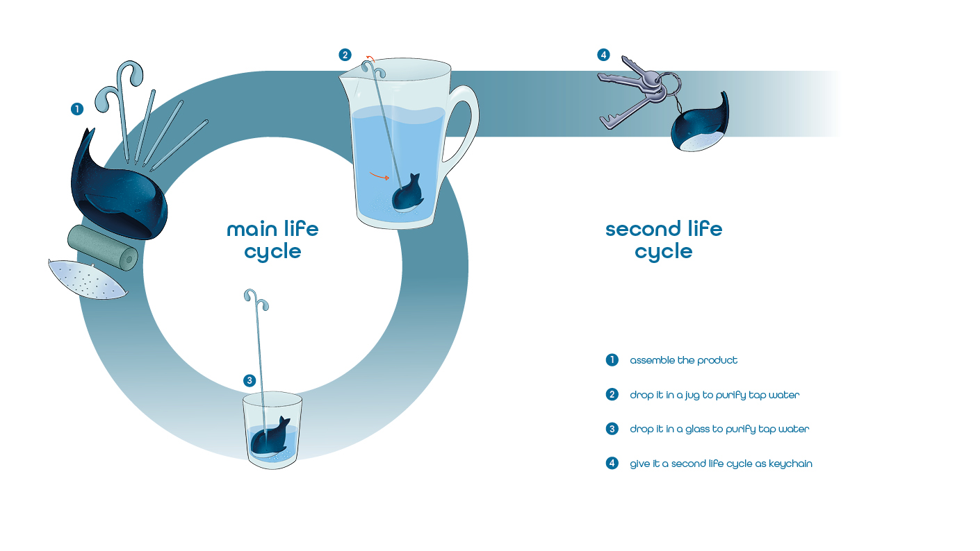 The product has a main life cycle as a water filter product but before being recycled it can have a second life cycle as keychain or a toy for little kids in order to extend at maximum the life span of the product before being recycled.