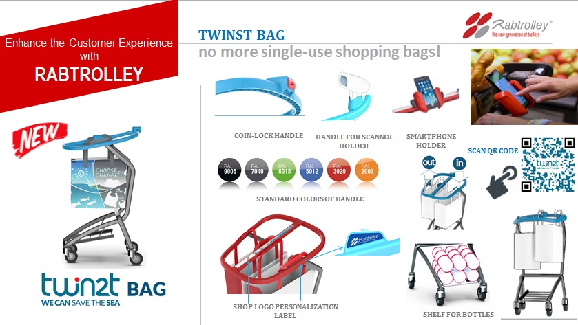 1. Twinst BAG: trolley without basket that invites people to bring to the store their own reusable bags. Twinst BAG is an innovative tool designed to make easy shopping with “old” bags to reduce usage of disposable bags according to "less waste" approach.