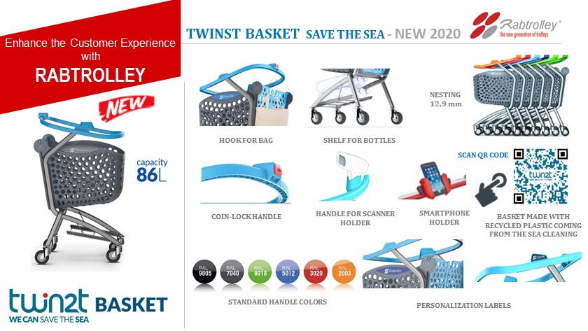 Shopping trolleys are the tools serving to carry chosen goods in the point of sales. However, models Twinst are not simple utility items, they have a special mission: give a contribution in promoting sustainable ecology & less waste policy in retail chains. They work to involve the shoppers directly in points of sales in being more conscious & responsible of their choices to show them that even their small decisions have an influence on the environment & the future and that can help to realize sustainability targets for better living together.