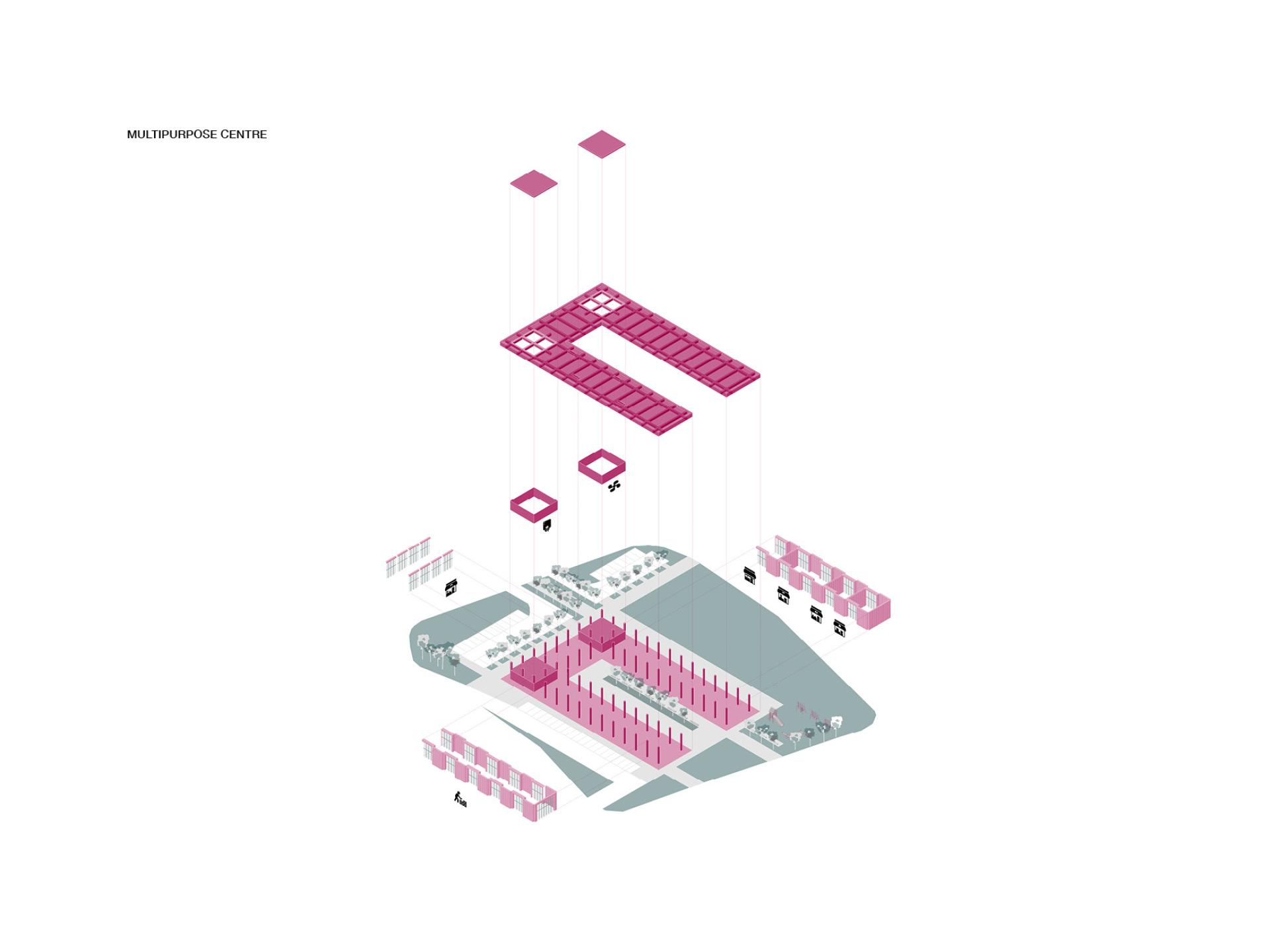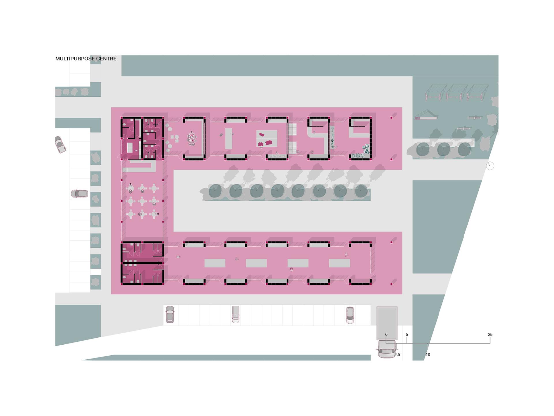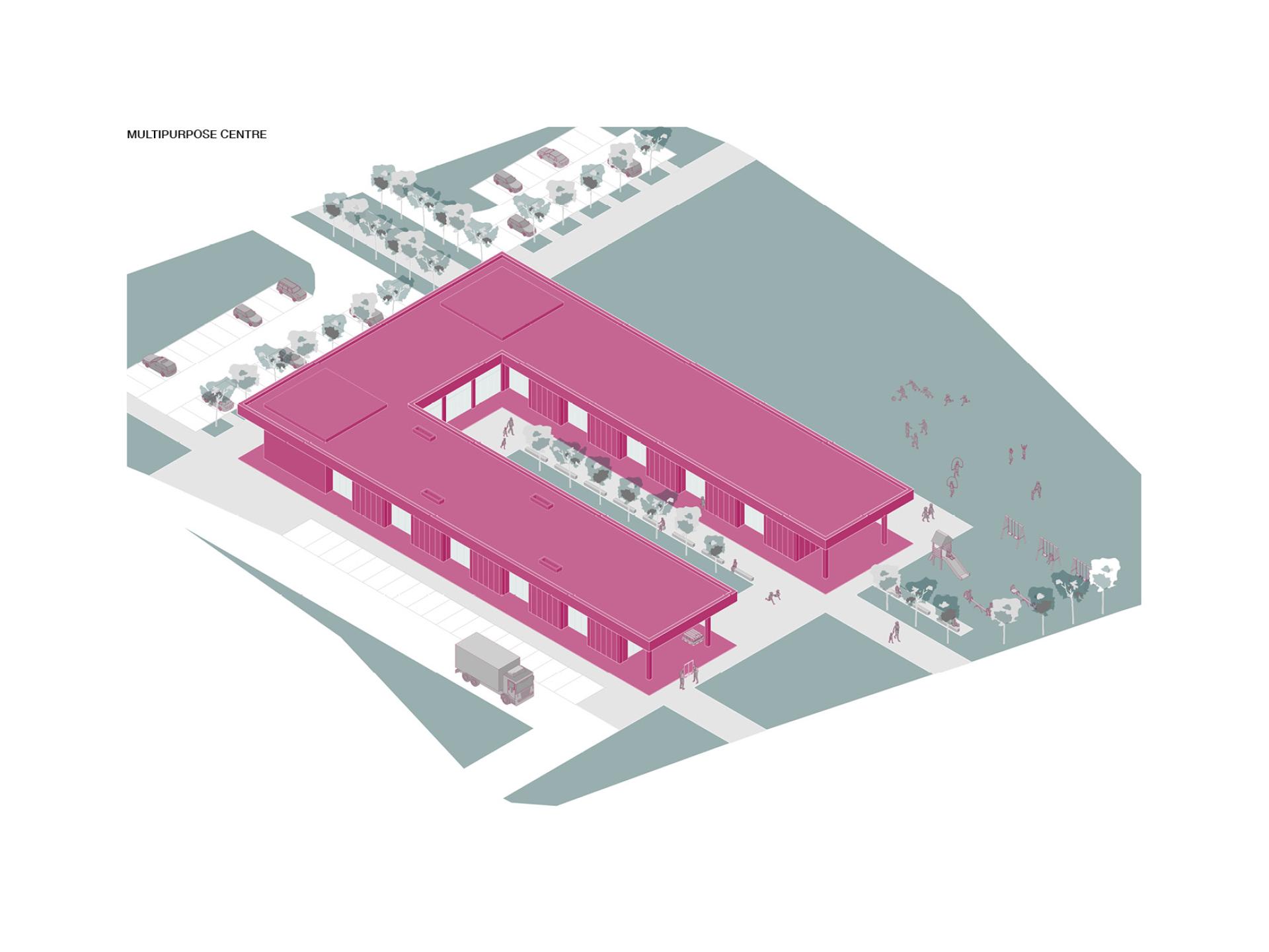 The multipurpose centre is the free time and work space. In order to obtain the most freedom in transitioning from the residential buildings to the multipurpose centre and not to interrupt the continuity between the two areas where these are located, the edge of the multipurpose centre closer to the residential buildings has been removed, making the border between external space and internal court disappear.